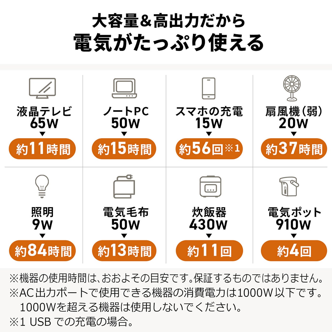 AC出力は最大1000Wまで対応し、暖房機器や調理家電なども使用できます。3ポート搭載で複数の機器を同時に使用することができます。(3ポート合計最大1000Wまで)