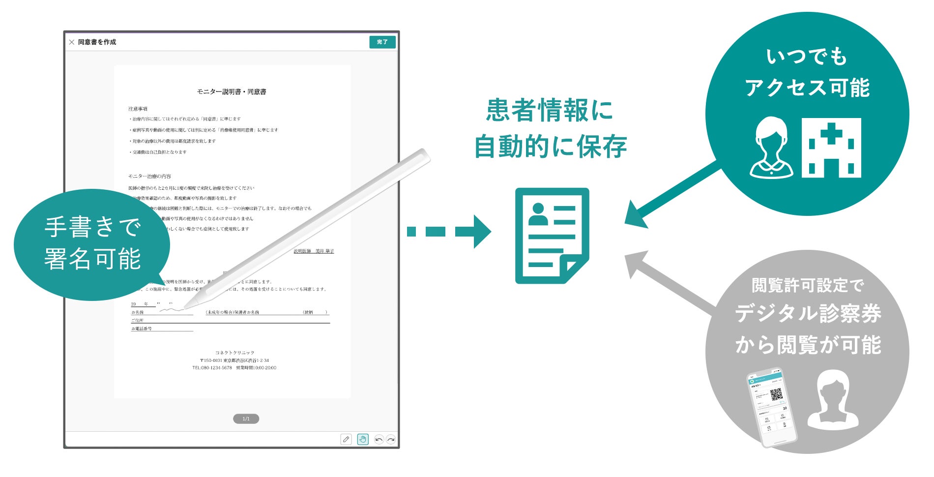 『電子同意書機能』を利用すると、事前にアップロードしておいた同意書のPDFファイルに、患者は手書きで署名することができます。署名が完了した同意書は患者情報に自動的に保存され、クリニックスタッフはいつでもアクセス可能です。