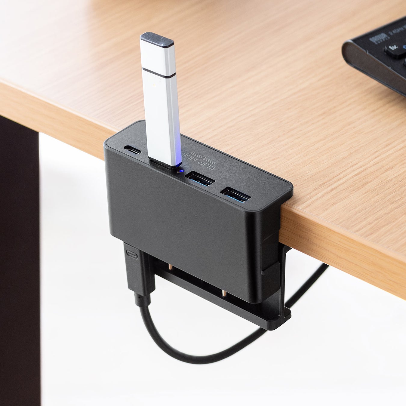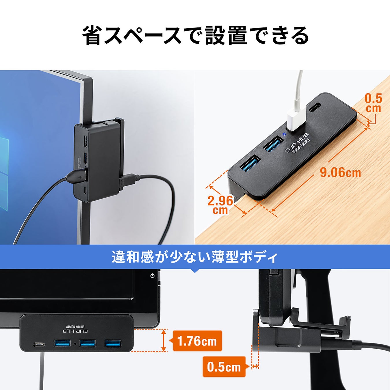 本製品は、クリップで机やモニターに取り付けられるUSBハブです。内部にバネを内蔵し、挟み込んで設置できます。