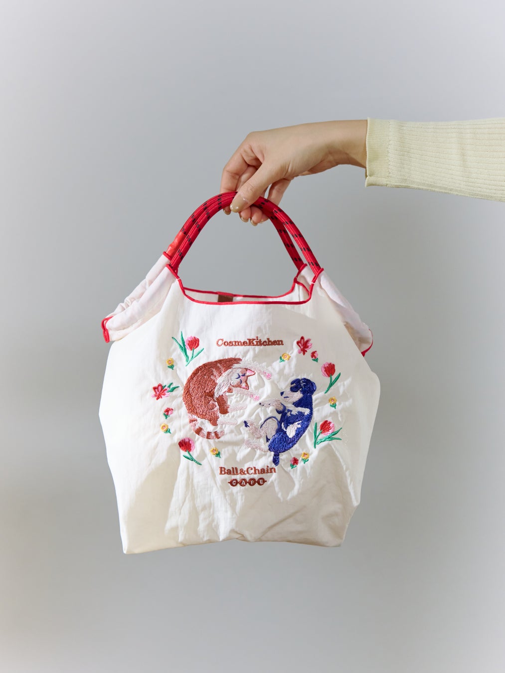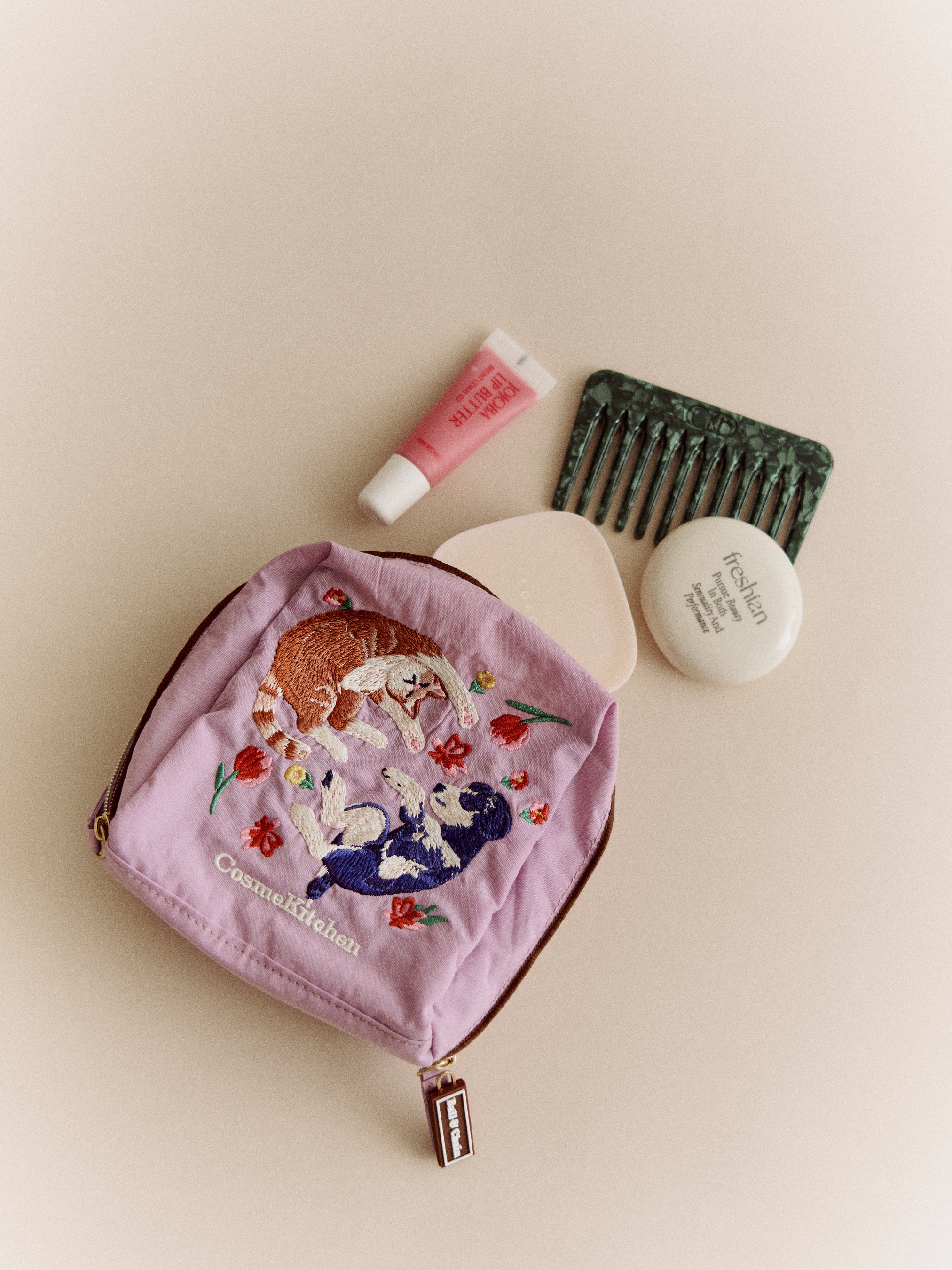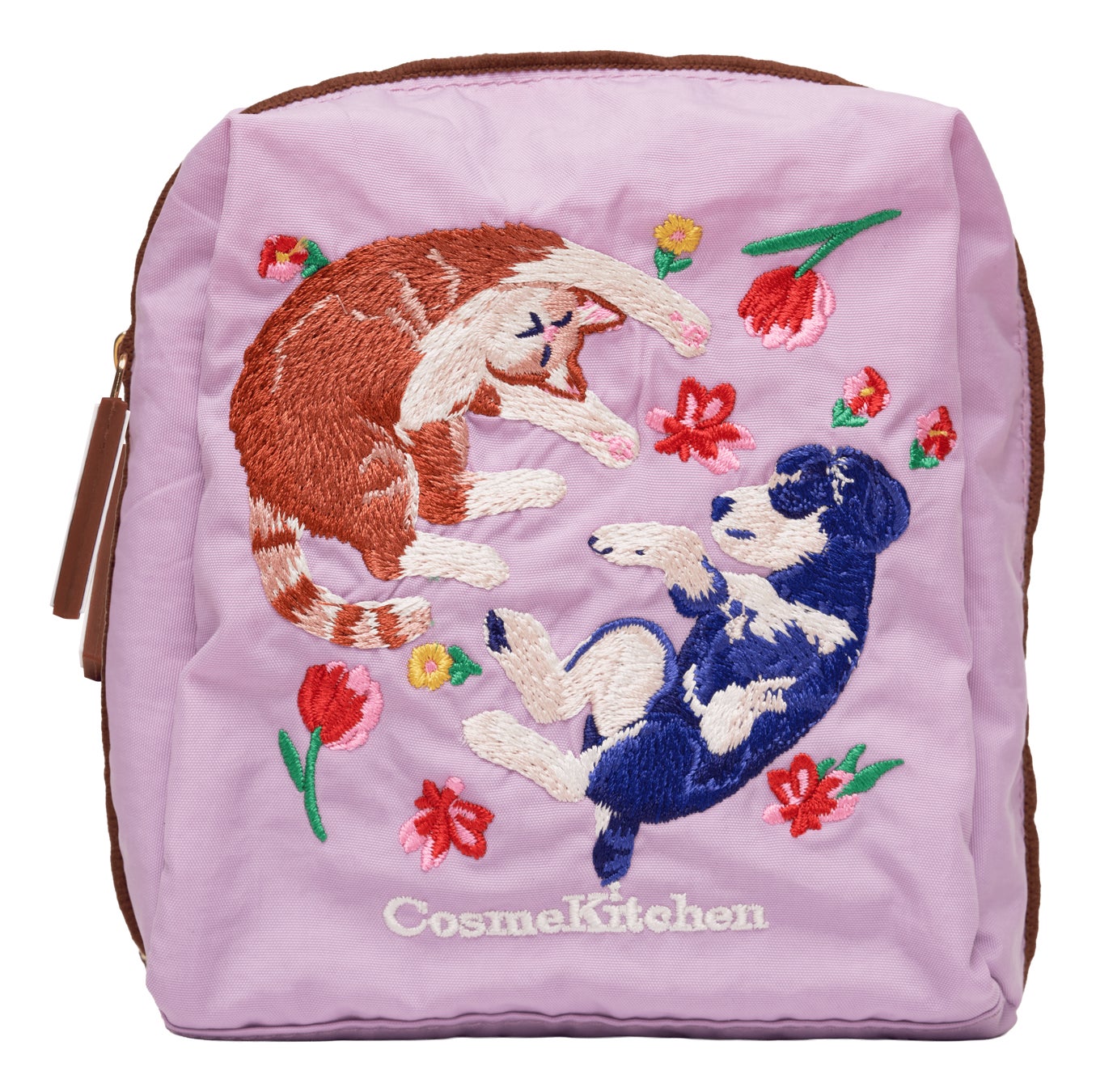 暖かな陽が差し込む花畑で寄り添いながら眠る犬と猫。見ているだけで心が温まる幸せなひとときを、<FEILER(フェイラー)>のシュニール織ハンカチと<Ball&Chain(ボールアンドチェーン)>の刺繍バッグ&ポーチに宿らせたコスメキッチンが贈る春のコレクション