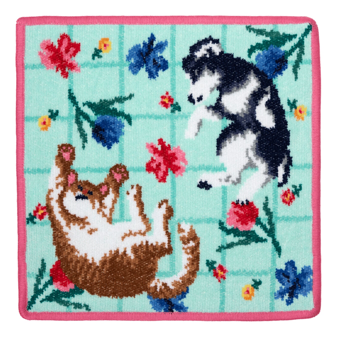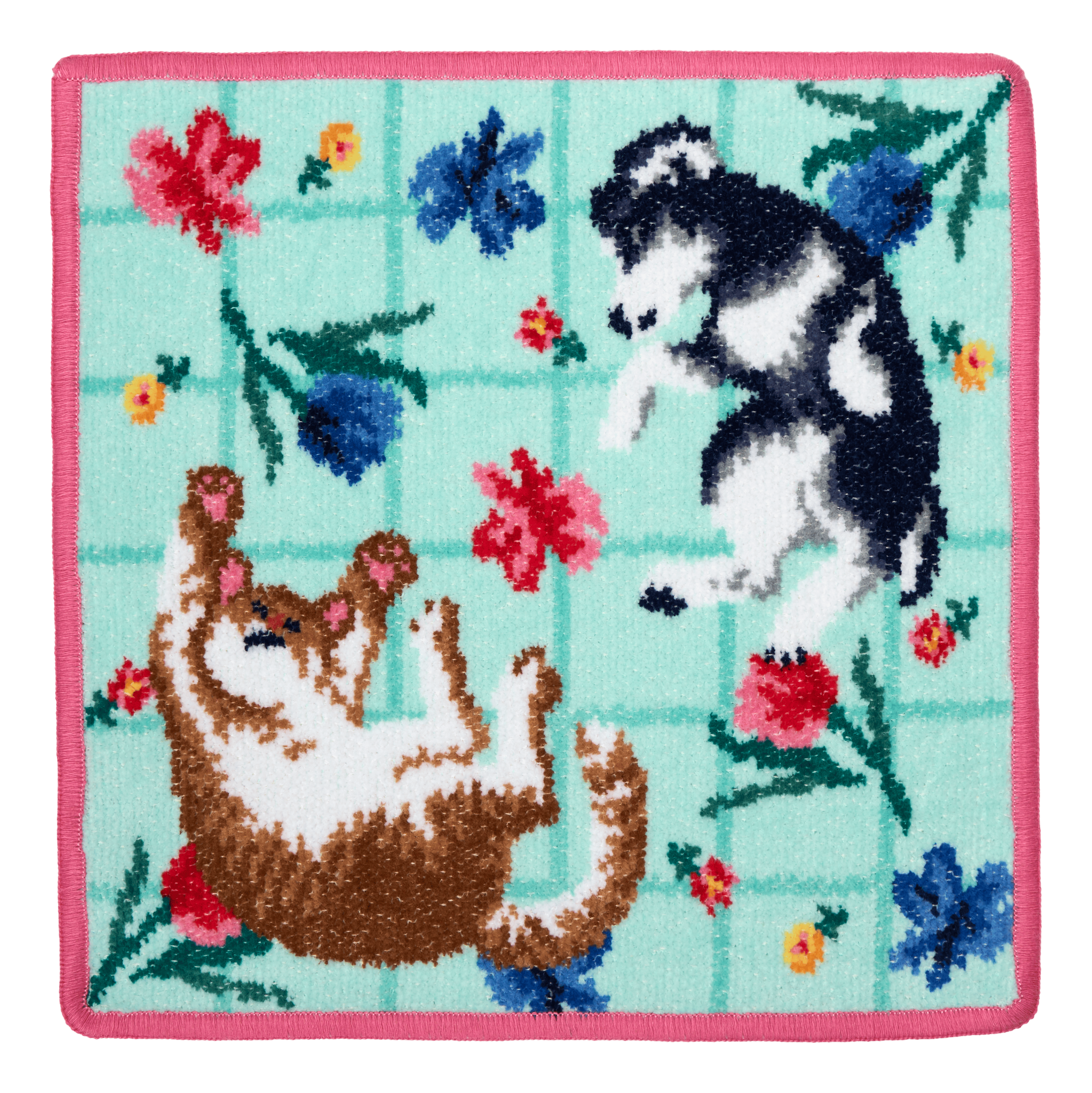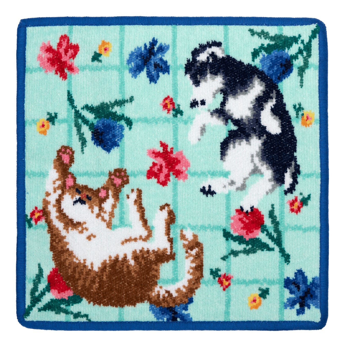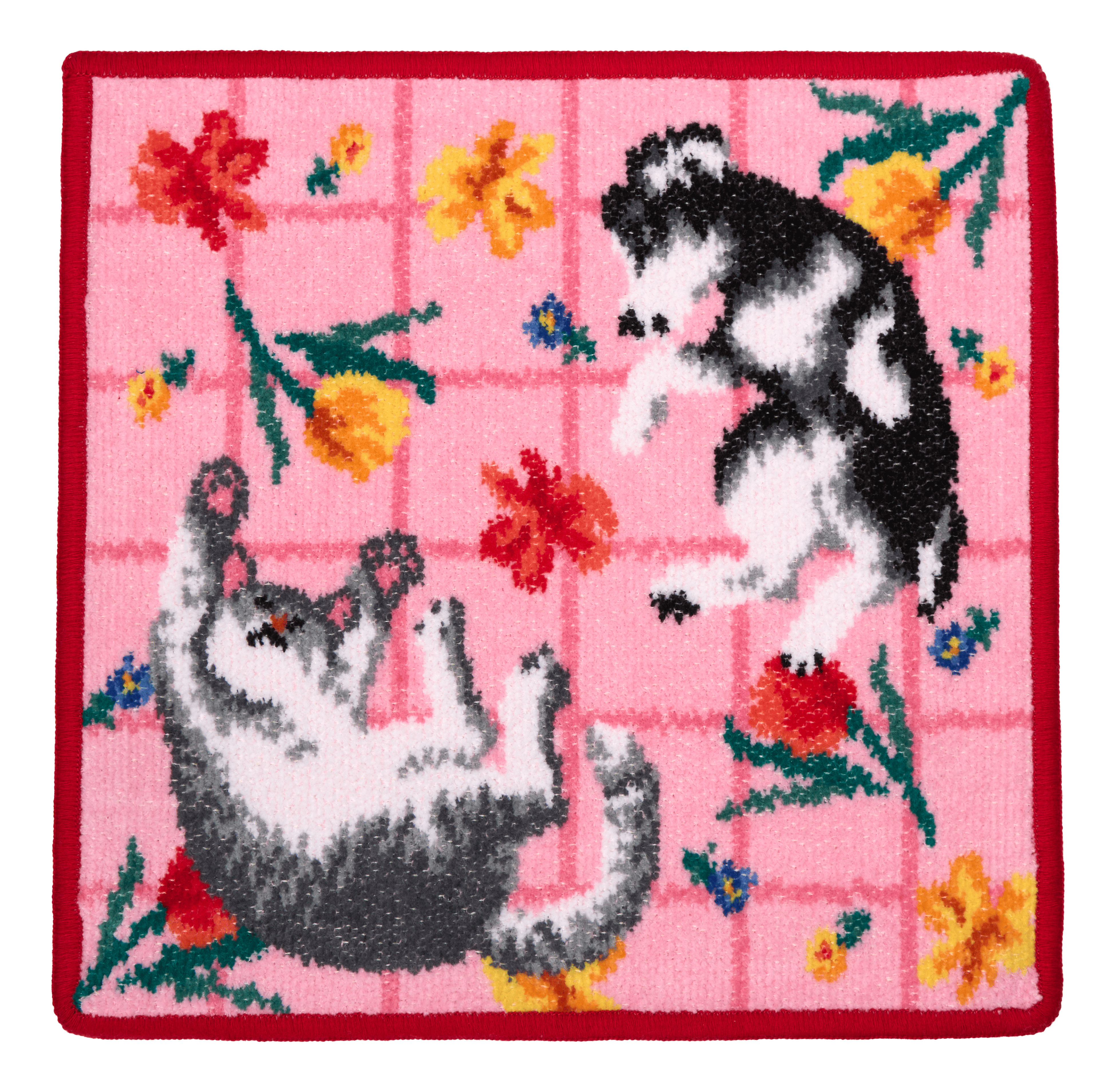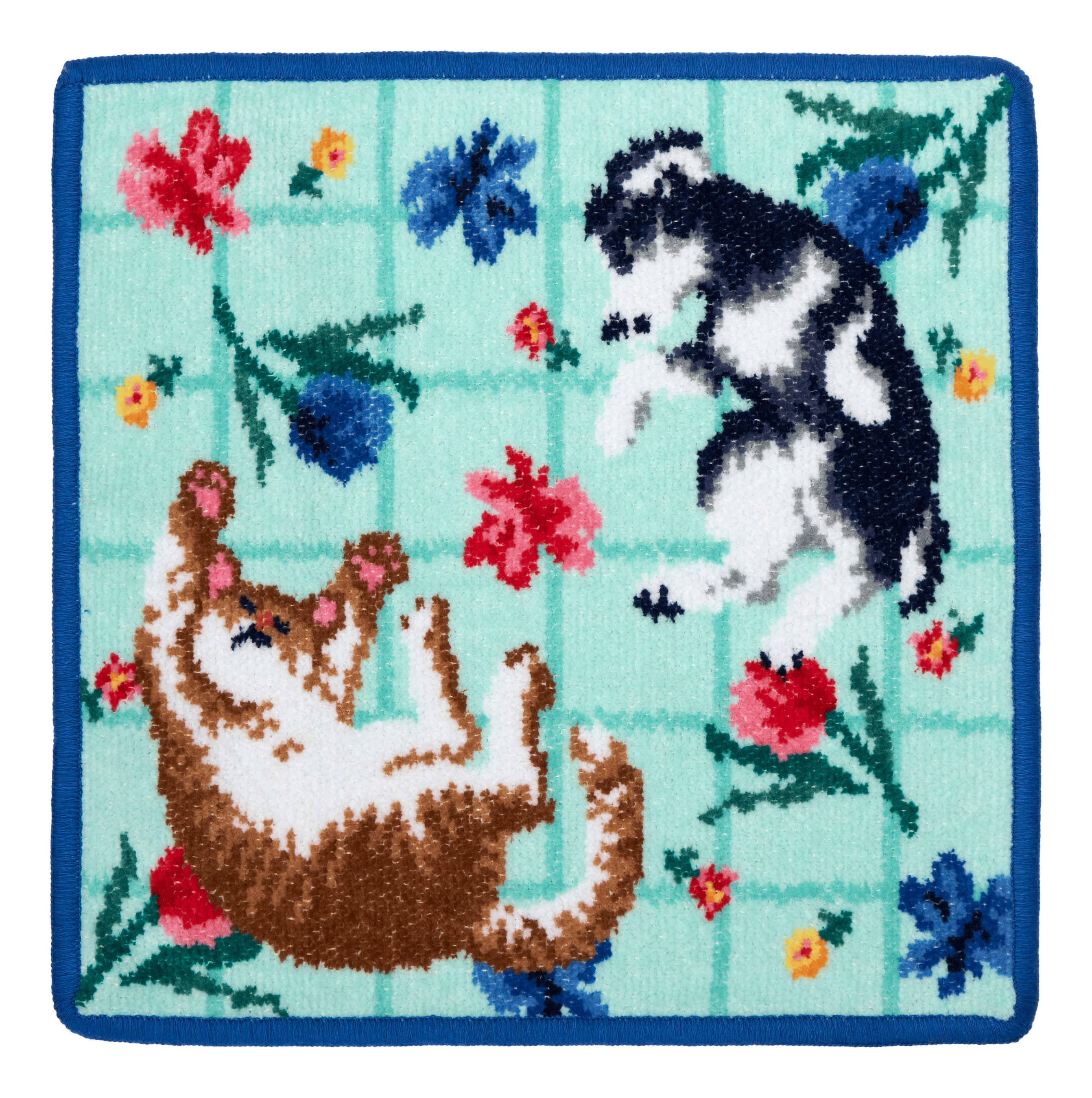 春の花々に包まれた犬と猫の幸せなひとときを、フェイラーならではの繊細なシュニール織で丁寧に表現しました。