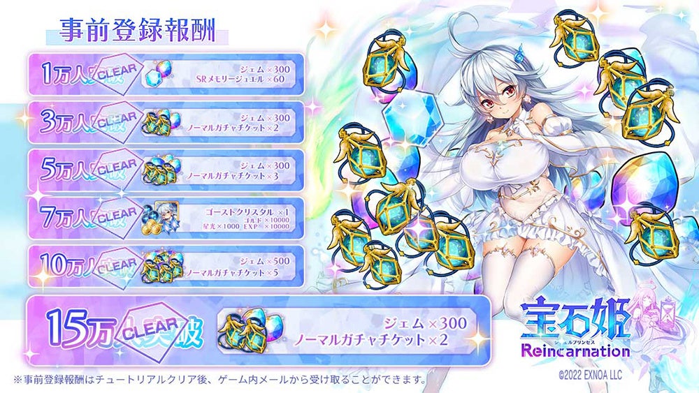 事前登録報酬はSSRゴーストクリスタル、ジェム×1700個、ノーマルガチャチケット×12、SRメモリージュエル×60、ゴルド×10000、宝石姫の星光×1000、宝石姫EXP×10000がチュートリアル完了後にアプリ内のメールにてプレゼントされます。