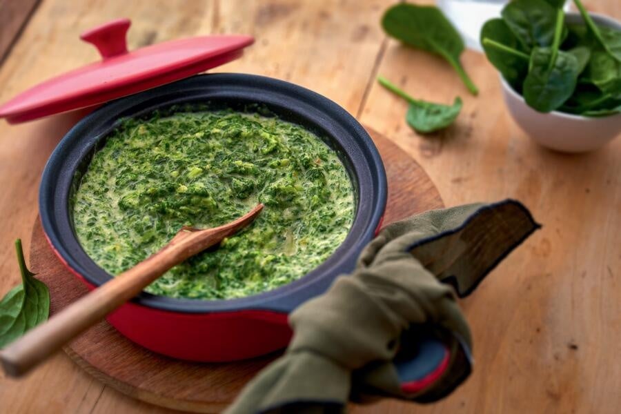 ほうれん草とクリームを合わせ塩とコショウ、ナツメグで味を調えました。加熱するだけでほうれん草の自然の甘みをしっかり感じる、優しい味わいのクリーム煮になります。