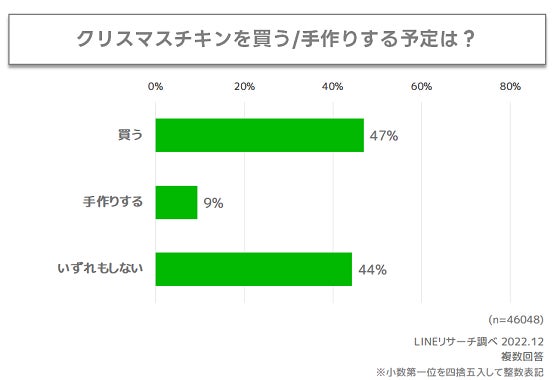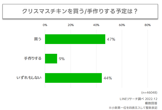 クリスマスチキンを「買う」予定と回答した人は5割弱で、「手作りする」予定と回答した人は1割弱となりました。「いずれもしない」予定と回答した人は4割超となり、クリスマスケーキに比べると用意をしない予定の人も多い様子がうかがえます。