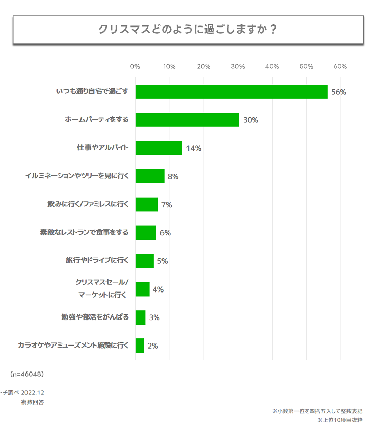 クリスマスをどのように過ごす予定なのか聞いたところ、「いつも通り自宅で過ごす」と回答した人が5割台半ばともっとも高くなりました。次いで「ホームパーティをする」と回答した人が3割で、こちらも昨年調査(※)の傾向と大きな変化はみられませんでした。