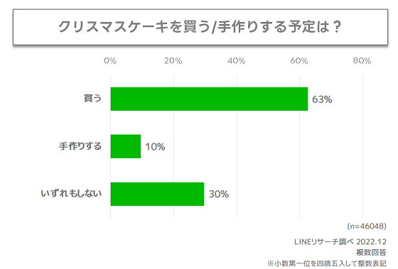 クリスマスケーキを「買う」予定と回答した人は6割超で、「手作りする」予定と回答した人は約1割となり、買う予定という人が圧倒的に多いことがわかりました。