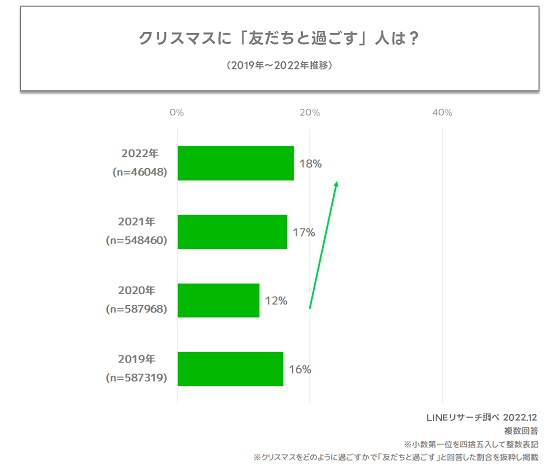 LINEリサーチが実施した調査をもとに過去3年間の結果と比較すると、「友だちと過ごす」という人の割合にやや変化がみられました。2020年は「友だちと過ごす」という人は12%で、その前の年と比べると減少する結果となりましたが、2021年から徐々に増加し、今年は18%となりました。