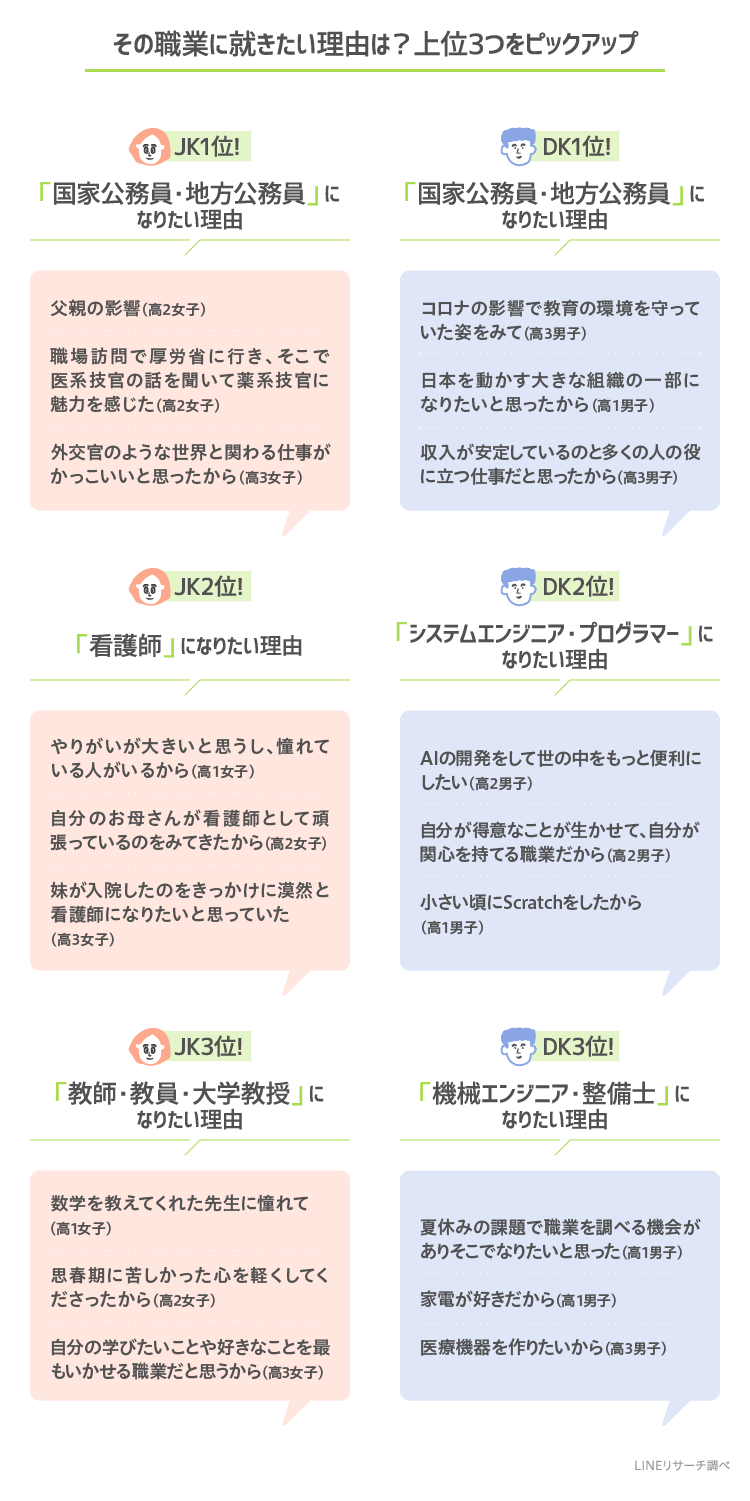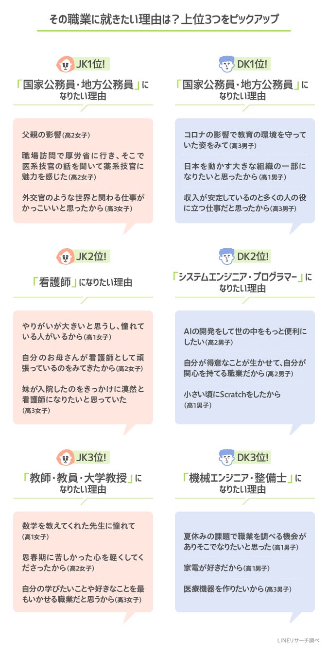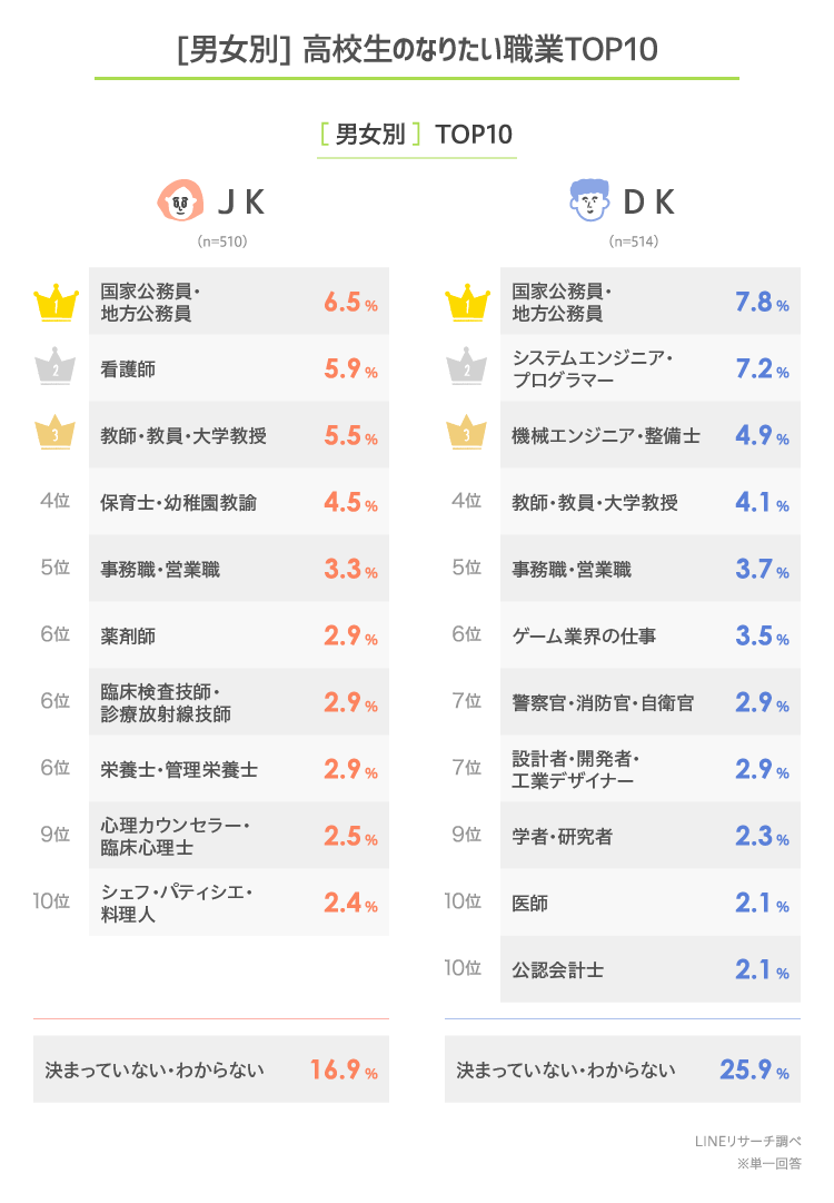 【LINEリサーチ】高校生のなりたい職業は「国家公務員・地方公務員」「教師・教員・大学教授」「システムエンジニア・プログラマー」が上位
