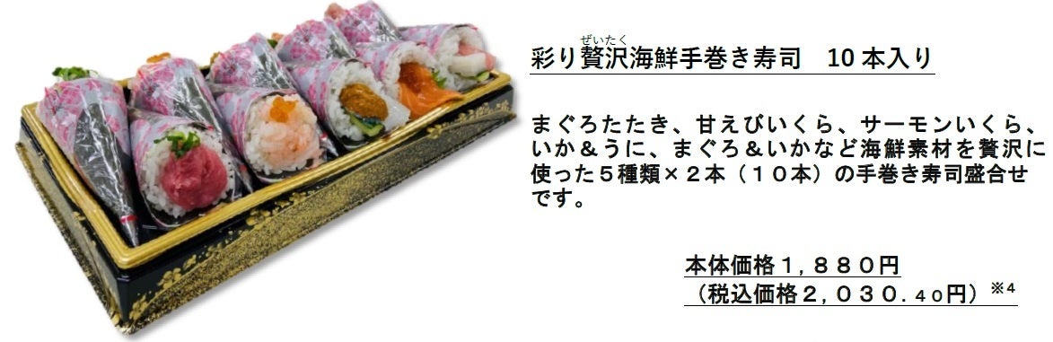おうちや帰省先で集いリアルなふれあいを一緒に楽しむニーズにお応えし、脂の乗った本まぐろ入りの「超まぐろ入りお刺身盛合わせ」や海鮮素材を贅沢に使った「彩り贅沢海鮮手巻き寿司(10本入り)」、新春を祝う紅白のバンズを組み合わせた「肉を味わう紅白 チーズバーガー」など、大人数で楽しめる「ごちそうメニュー」を用意します。