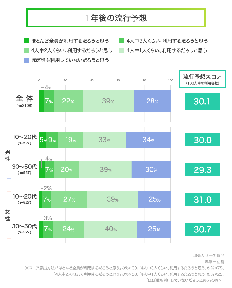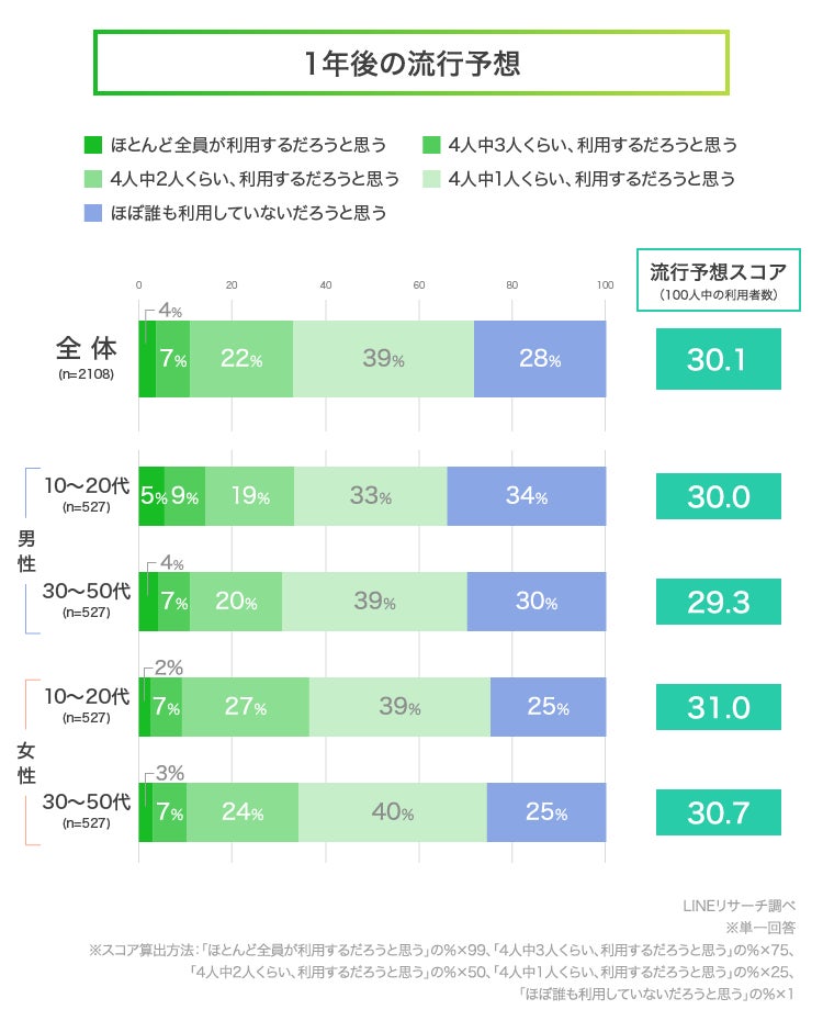 流行体感としては、“およそ7人に1人が利用している”イメージを持たれていることがわかりました。そして、今から1年後には、現在の約2倍にあたる“およそ3人に1人くらいが利用していそう”というイメージを持たれていることがわかりました。