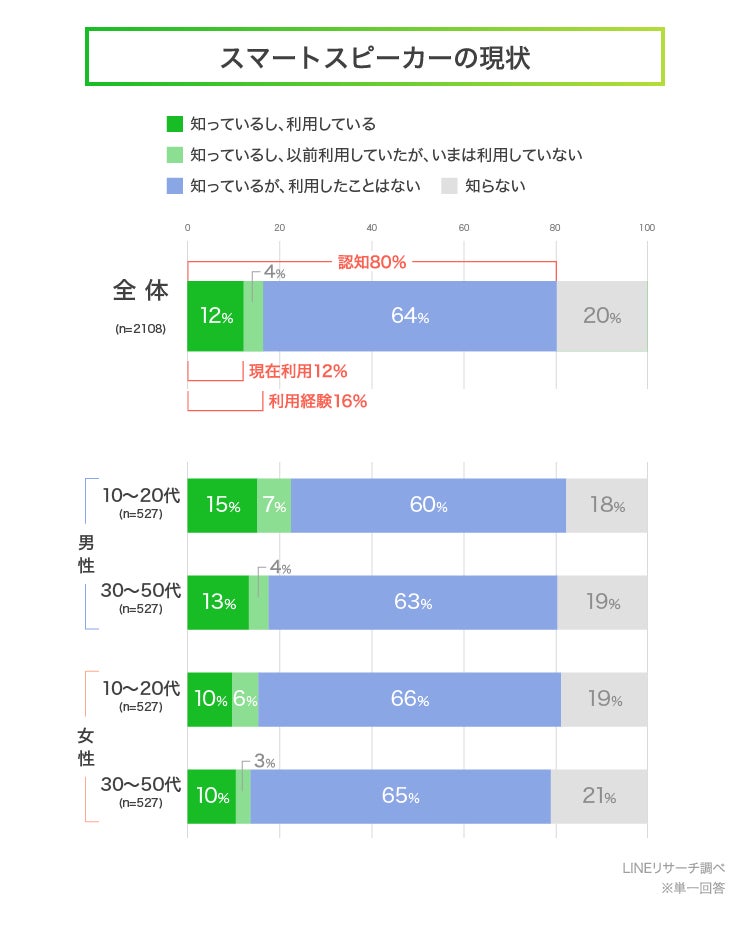 【LINEリサーチ】スマートスピーカーの利用経験率は16% 今後の利用意向は男性10〜20代でもっとも高く、約5割という結果に