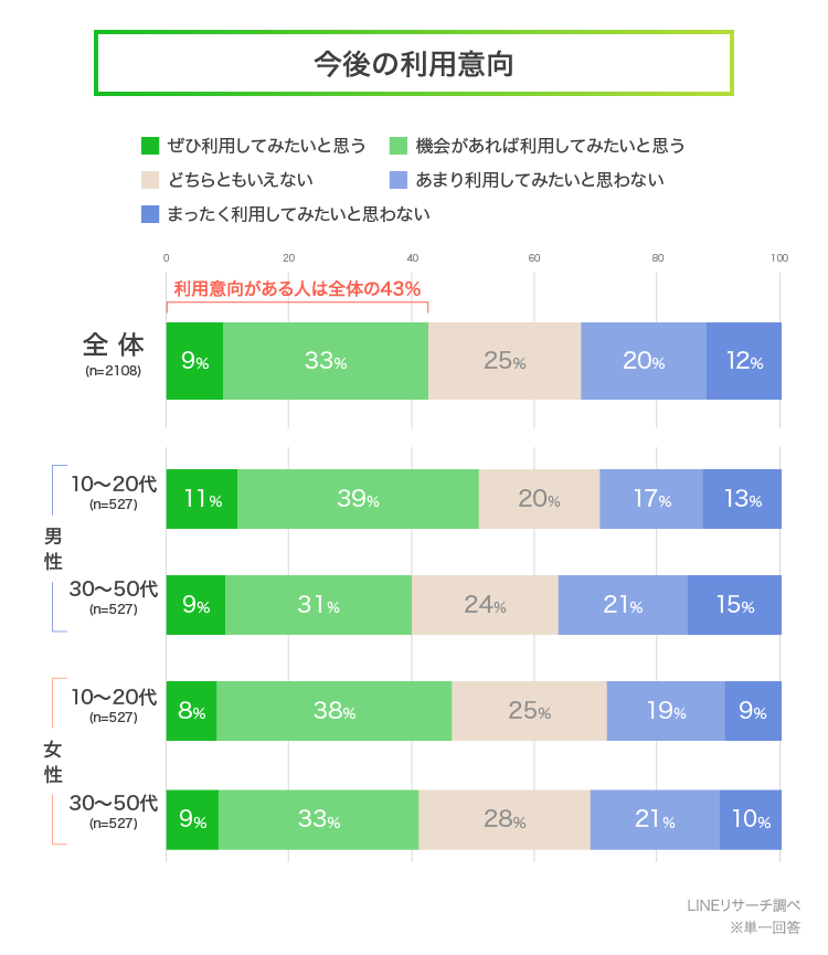 一方、利用意向がない人の割合(「あまり利用してみたいと思わない」「まったく利用してみたいと思わない」の合計)は、全体で32%でした。