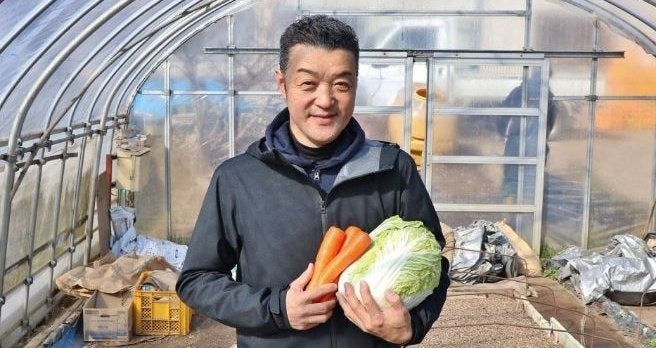 (上から鈴木光一氏、ブランド野菜「とうみぎ丸」、「紅御前」、「冬甘菜」)