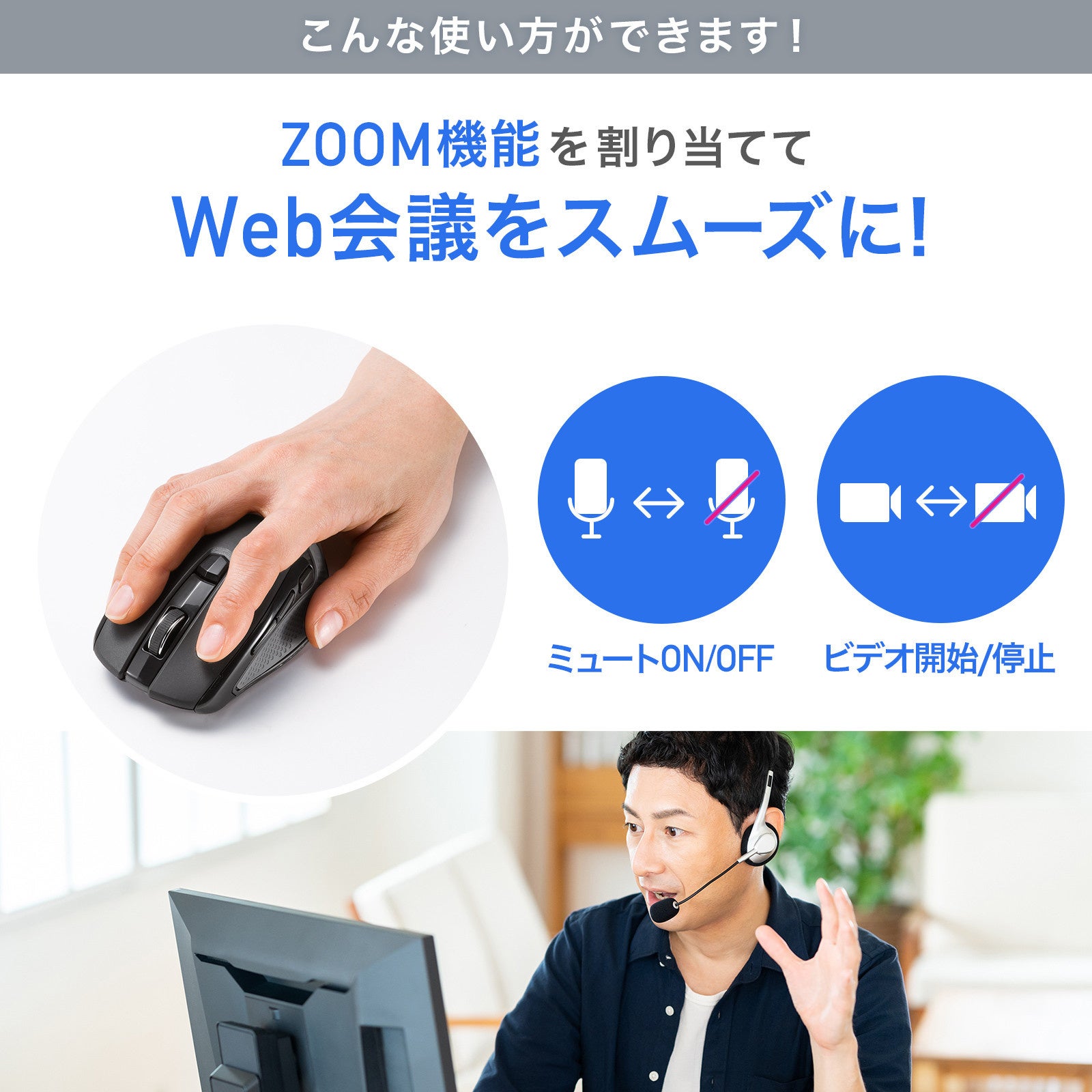ボタン割り当てソフト「SANWA Mouse Function Setting」を使用して、ホイールボタン・サイドボタンに機能の割り当てができます。例えばZOOMのミュートのON/OFF、ビデオ開始/停止などを割り当てることでWeb会議がスムーズに行えます。自分に最適なボタン設定をして、パソコン操作の効率アップを期待できます。