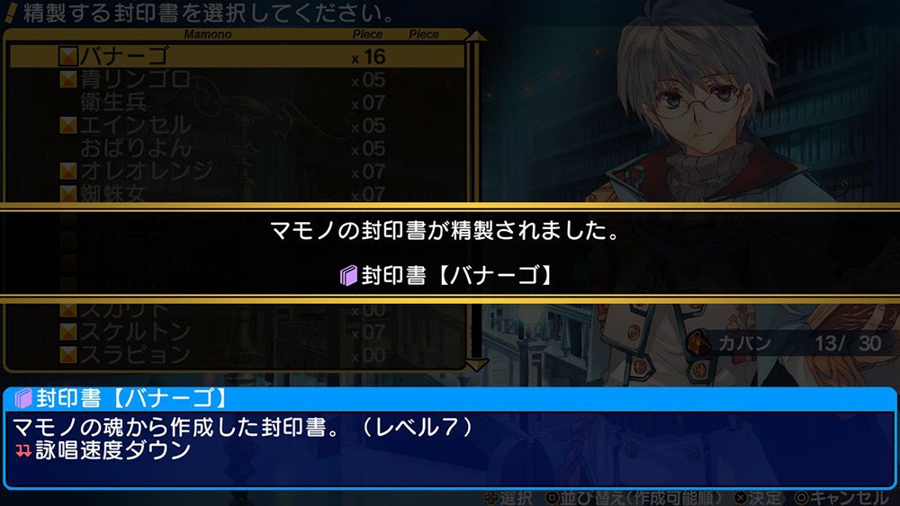 そしてマモノの魂を一定数集めると、「マモノの封印書」を作成することが可能。この封印書は味方キャラクターに装備することができ、ステータス上昇を始め、属性攻撃の耐性アップ、はたまた被ダメージを一定TPに変換など、種々様々な特殊効果を発揮する。戦えば戦うほど獲得できるので、通常戦闘の虚無感がないのが嬉しい。