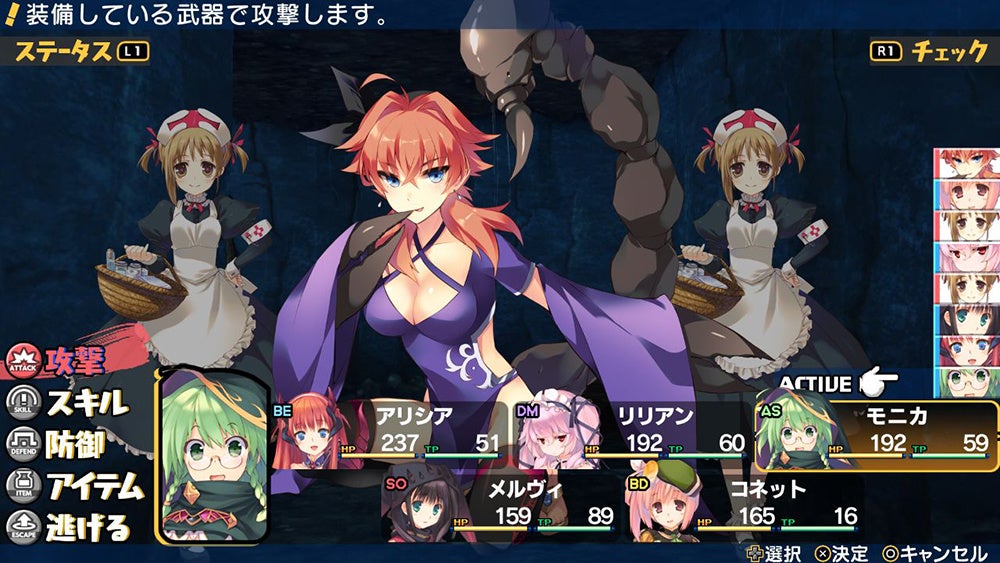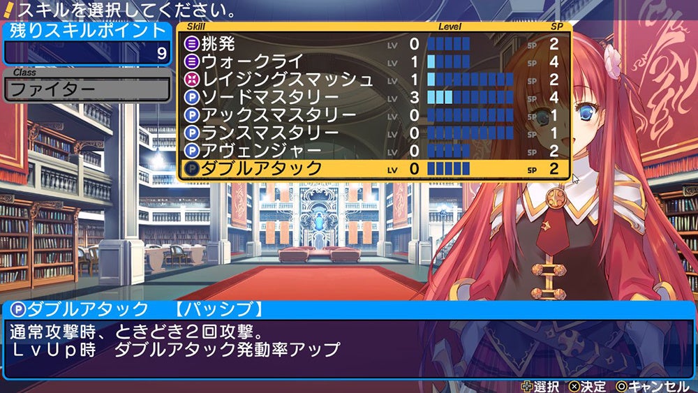 彼女たちはあらかじめクラス、いわゆる職業が決まっている。たとえばメルヴィなら魔法が得意なマジックユーザー、アリシアなら肉弾戦が得意なファイターといった具合だ。レベルアップするとスキルポイントを獲得でき、そのキャラクターのスキルに自由に振り分けられるため、同じキャラクターであっても育て方ひとつで異なる性能を発揮する。