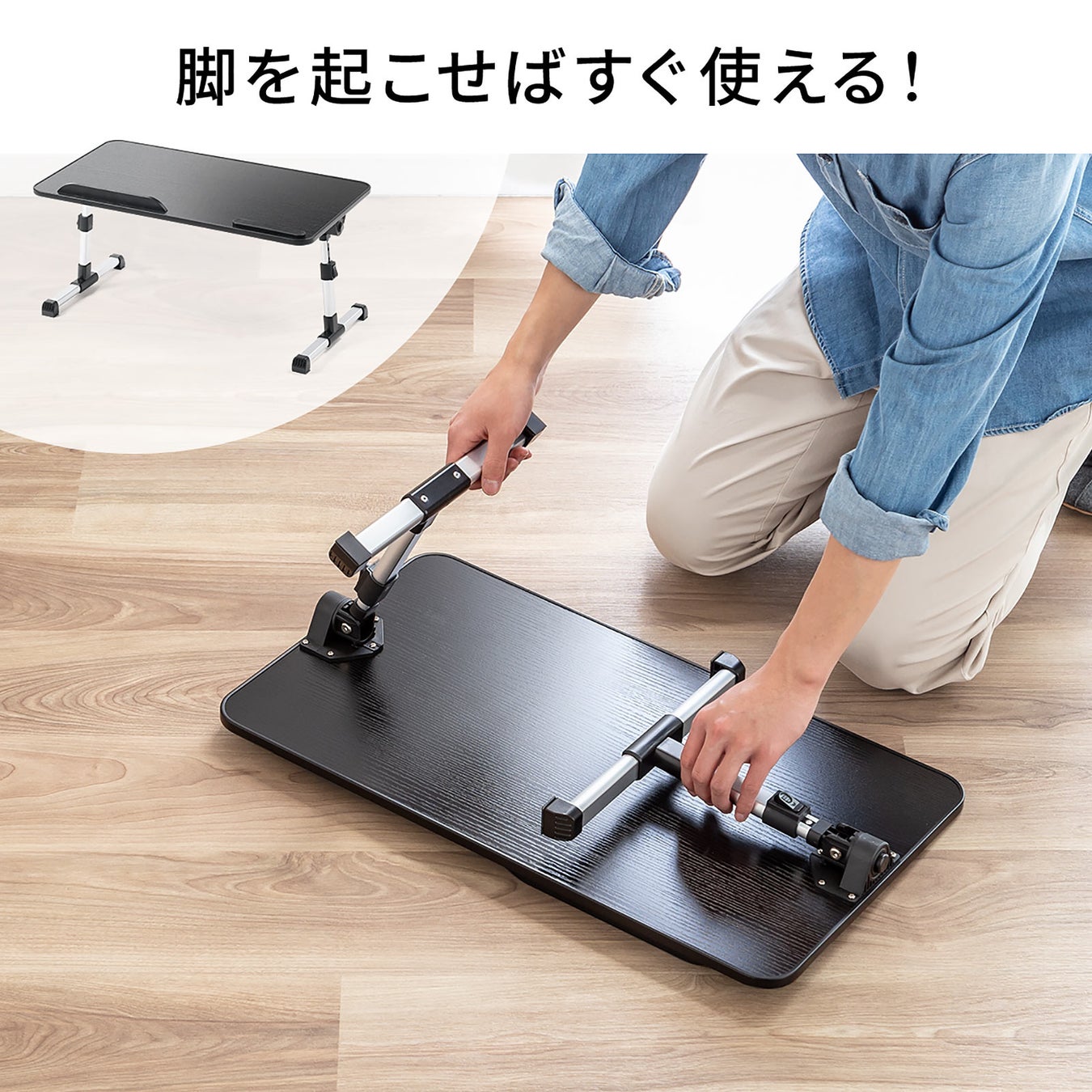 本製品は、脚を広げるだけで簡単に組み立てられる、折りたたみ式ローデスクです。
