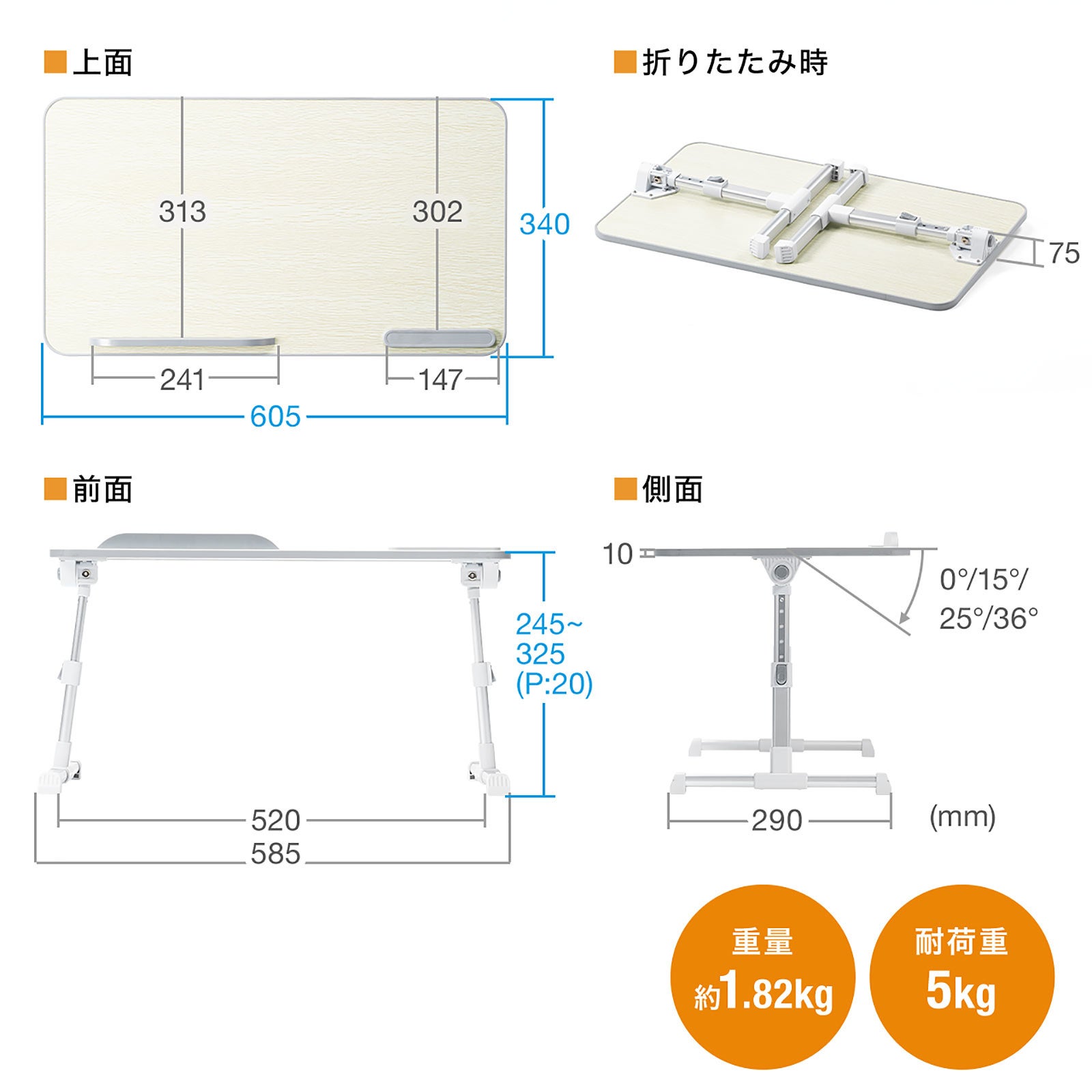 本製品のサイズは展開時/約W602×D332×H245~325mm、折りたたみ時/約W602×D332×H75mm、 重量は約1.82kgです。