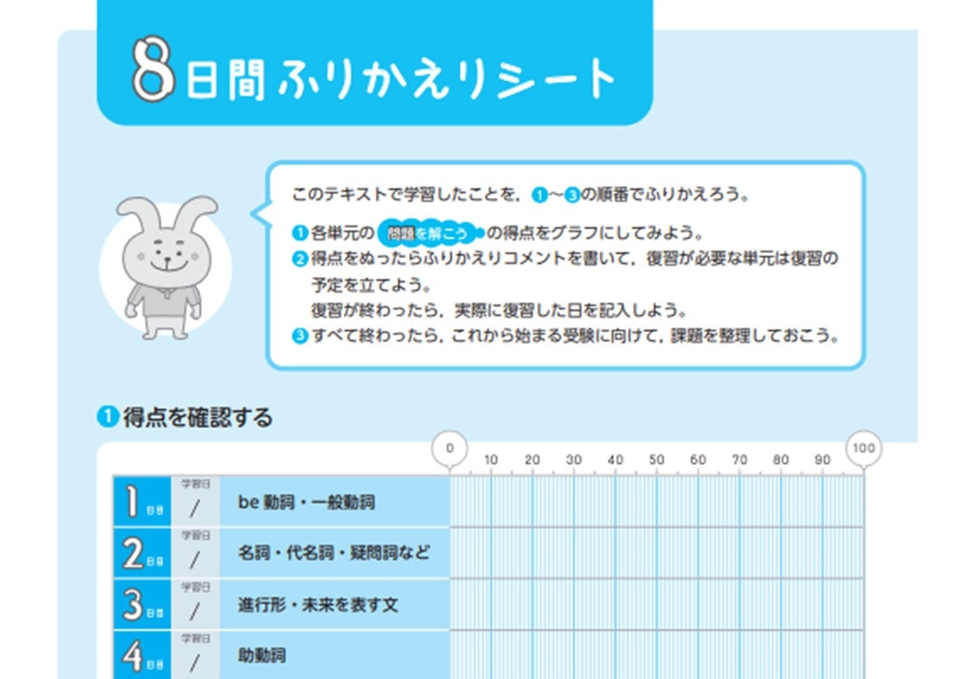 ふりかえりシートでは、各単元の点数を記録しておくことで、弱点を分析します。