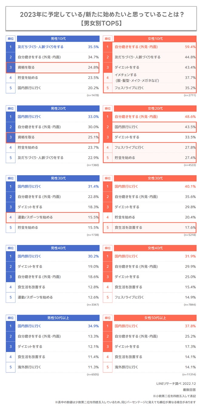 女性10~20代では「フェス/ライブに行く」が3割前後と高く、5位以内にランクイン。そのほか、女性10~20代では「貯金を始める」が3割弱と高めで、女性20代では5位にランクインしました。