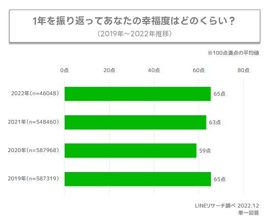 ■2022年を振り返った幸福度は、新型コロナウイルス感染拡大前のスコアに戻り65点