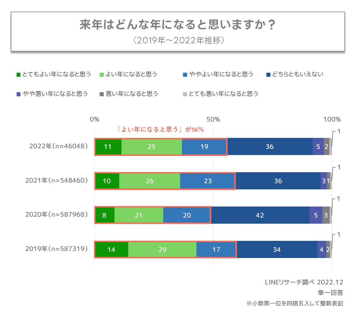 2023年はどんな年になると思うか聞いてみました。昨年に比べ【よい年になると思う】(「とてもよい年になると思う」「よい年になると思う」「ややよい年になると思う」の合計)と回答した人は56%となり、昨年よりもわずかに下回る結果となりました。