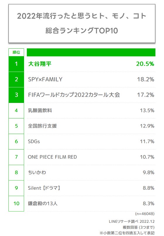 ■2022年流行ったと思うヒトやコトは、「大谷翔平」「SPY×FAMILY」「FIFAワールドカップ2022カタール大会」が上位
