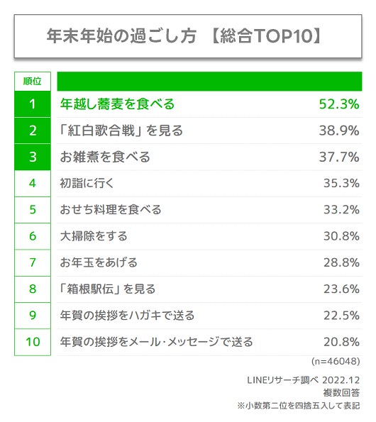 【LINEリサーチ】年末年始の過ごし方は「年越し蕎麦を食べる」が圧倒的1位 今年流行ったと思うヒトやコトは、「大谷翔平」「SPY×FAMILY」「FIFAワールドカップ2022カタール大会」が上位
