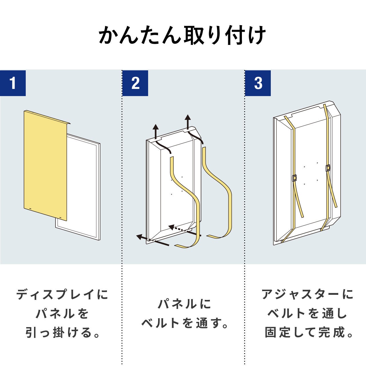 パネル裏面にベルトがあり、長さ調整をして固定できます。落下を防止することが出来ます。