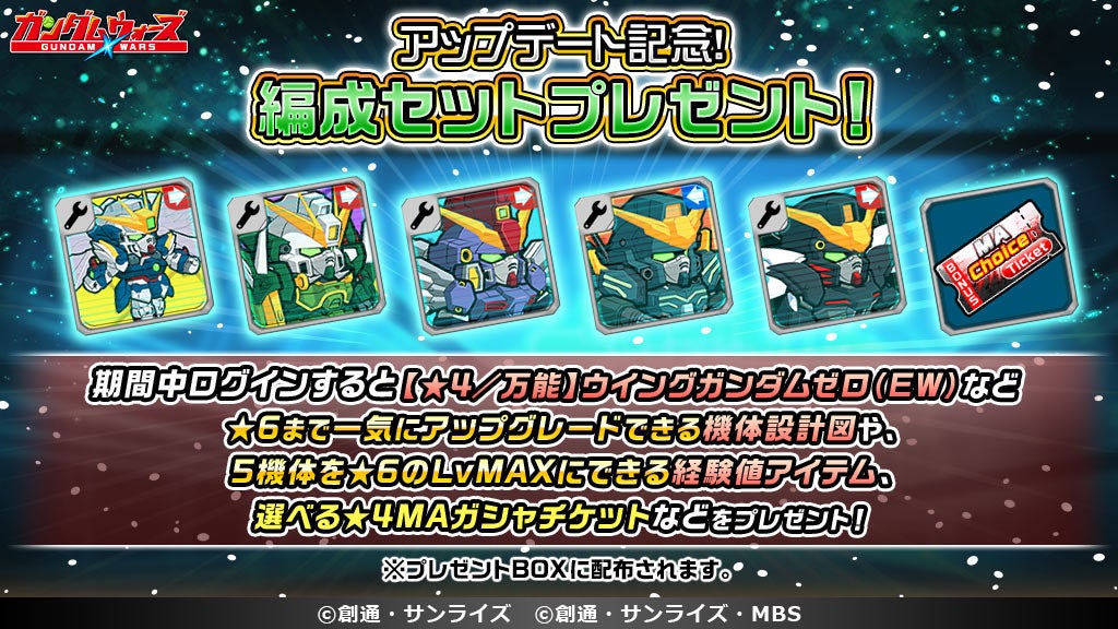 期間中、初回ログインで『新機動戦記ガンダムW Endless Waltz』に登場する機体5体の編成セットをプレゼントいたします。