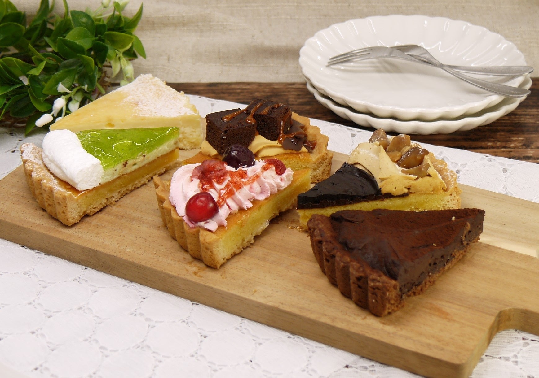 「ベイクドチーズケーキ」「シャインマスカットタルト」「カラメルブラウニータルト」「ベリータルト」「生チョコモンブランタルト」「チョコタルト」のアソートケーキです。チョコやチーズ、ベリーやフルーツソースを彩り良く組み合わせ、華やかに仕立てました。