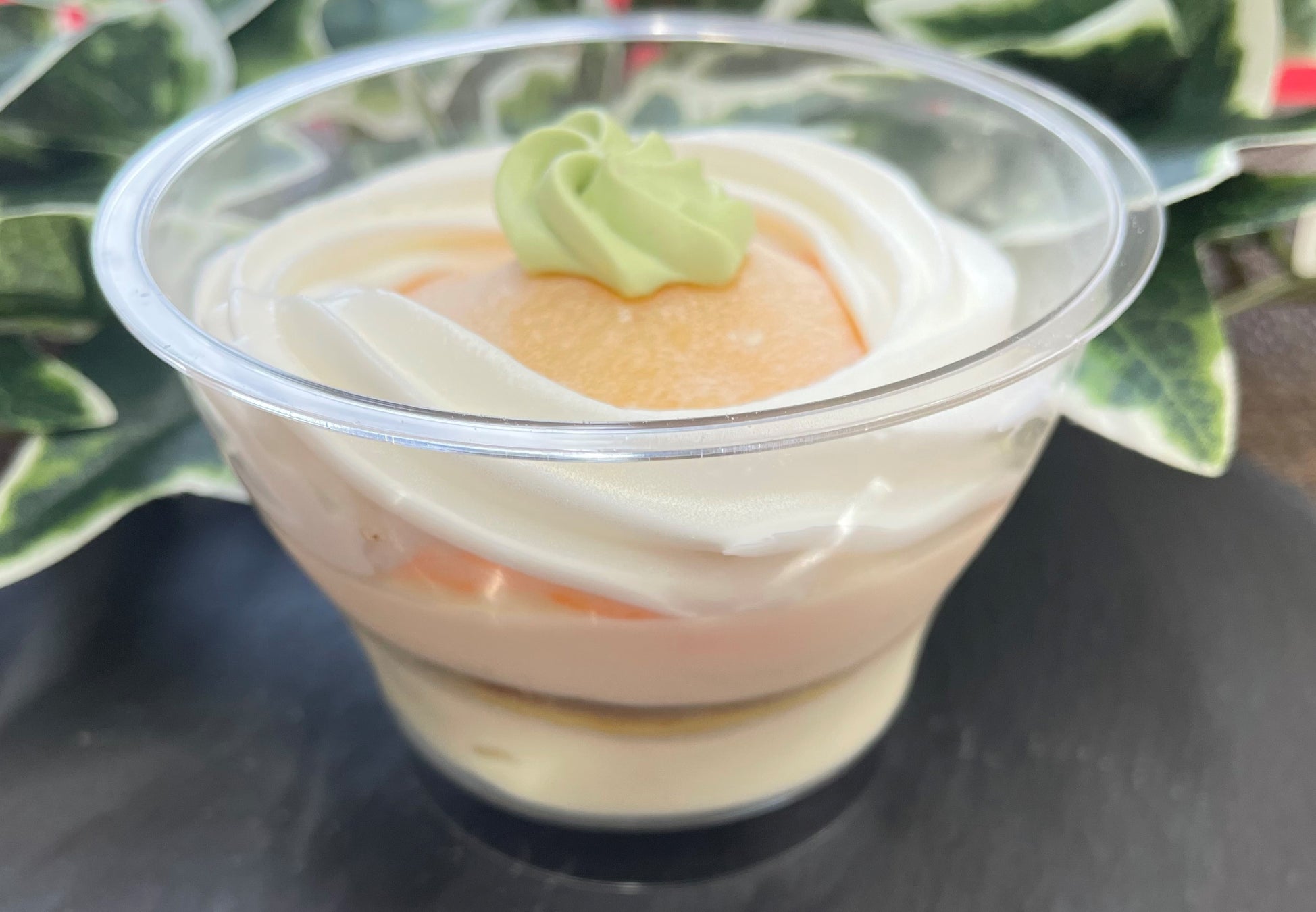 クリームとどら焼きの皮を重ねた上にホイップカスタード、フレッシュなみかん、やわらかい求肥餅をかぶせ、さらにクリームを絞った和洋折衷の味わいが楽しめるスイーツです。