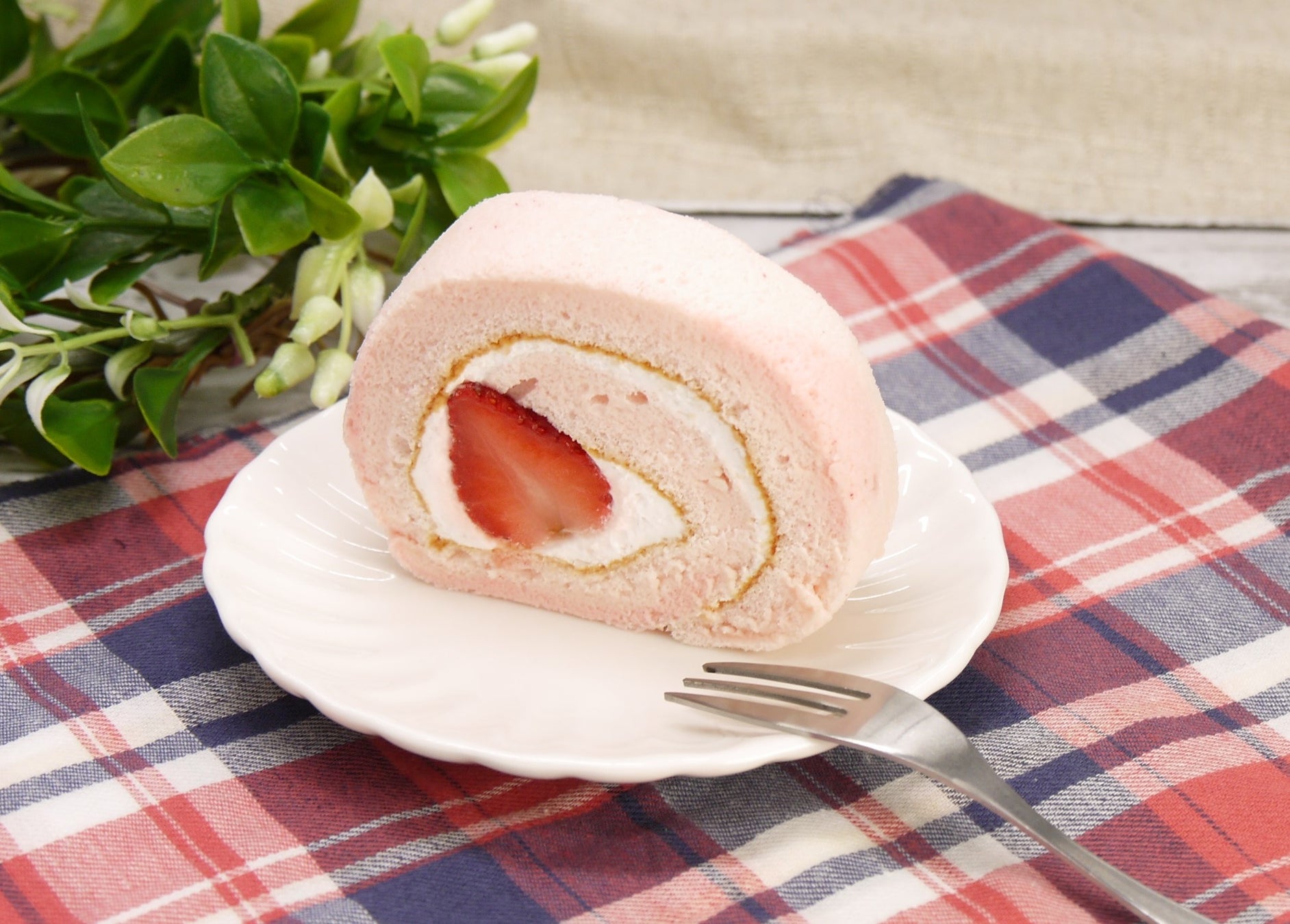 ピンクに色付けたふわふわ食感の生地でホイップクリームと甘酸っぱいいちごムース、旬のフレッシュな苺を巻いたロールケーキです。
