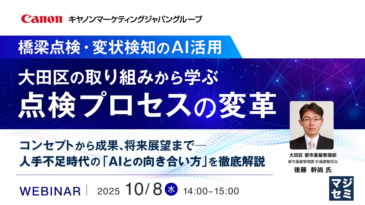 マジセミ株式会社は「【橋梁点検・変状検知のAI活用】大田区の取り組みから学ぶ点検プロセスの変革」というテーマのウェビナーを開催します。