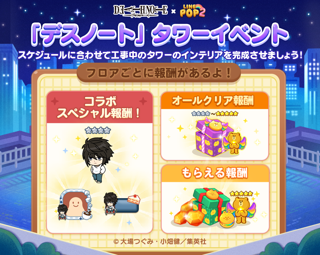 本日より「LINE POP2」と『DEATH NOTE』のコラボ開始!「夜神月」「L」「弥海砂」など、人気キャラクターたちがゲーム内に登場