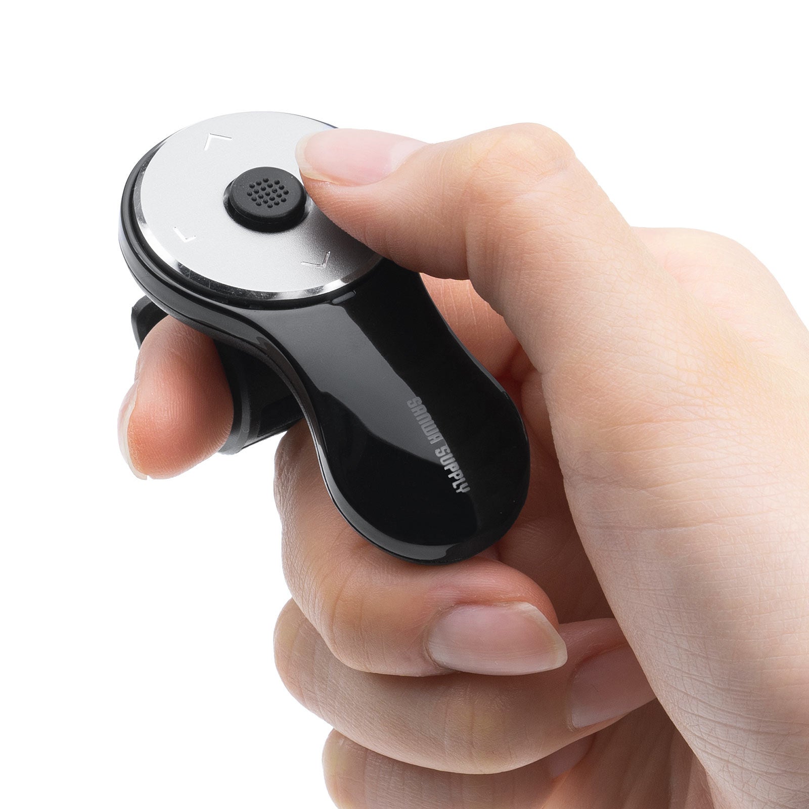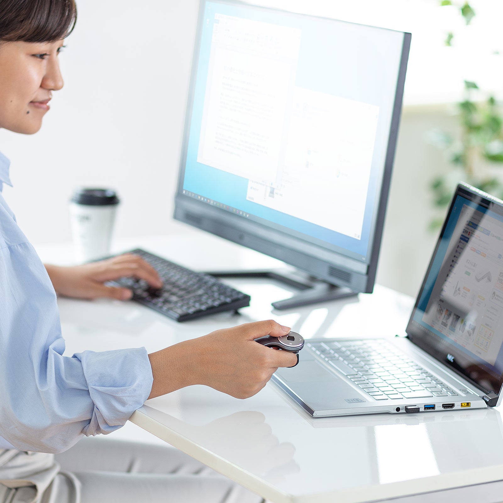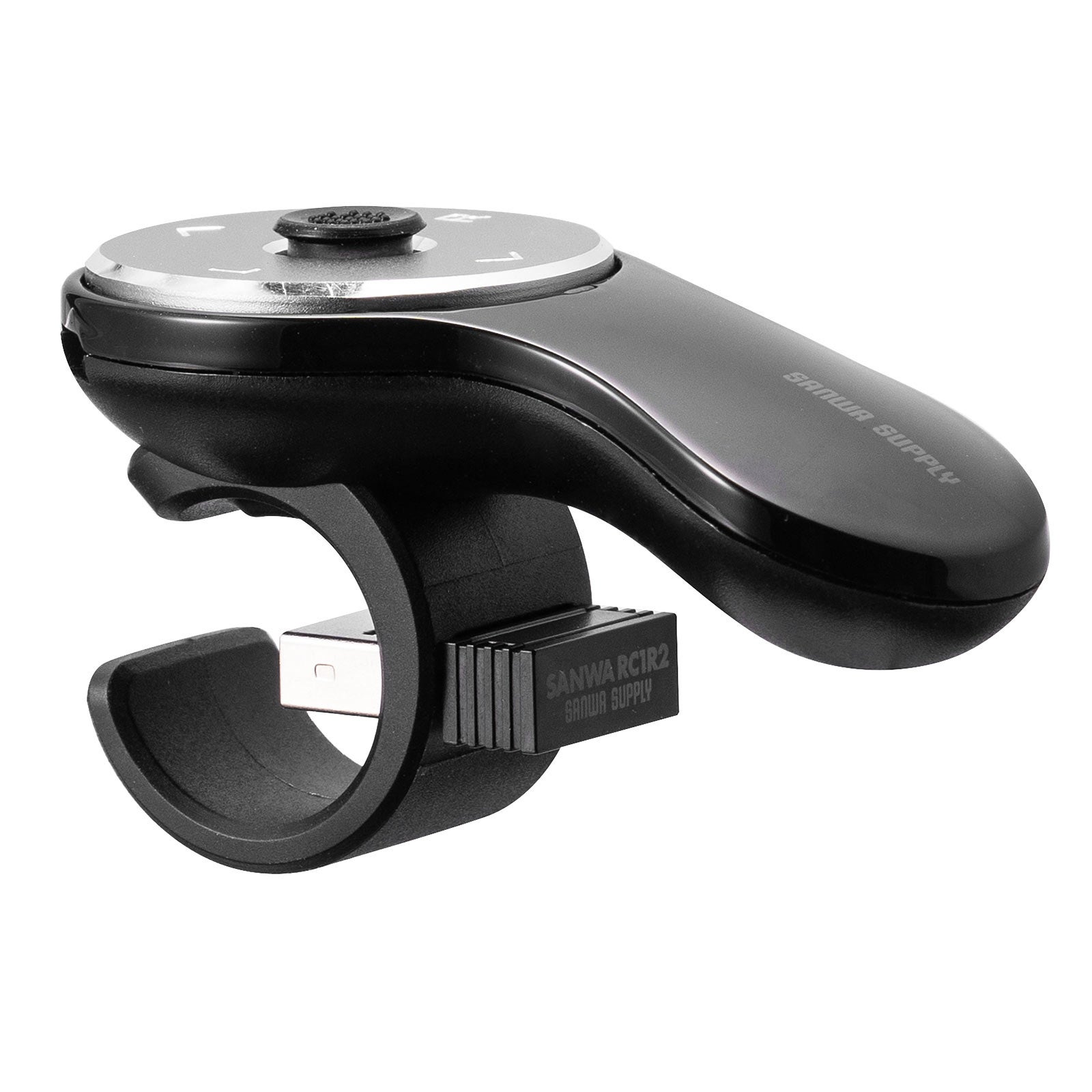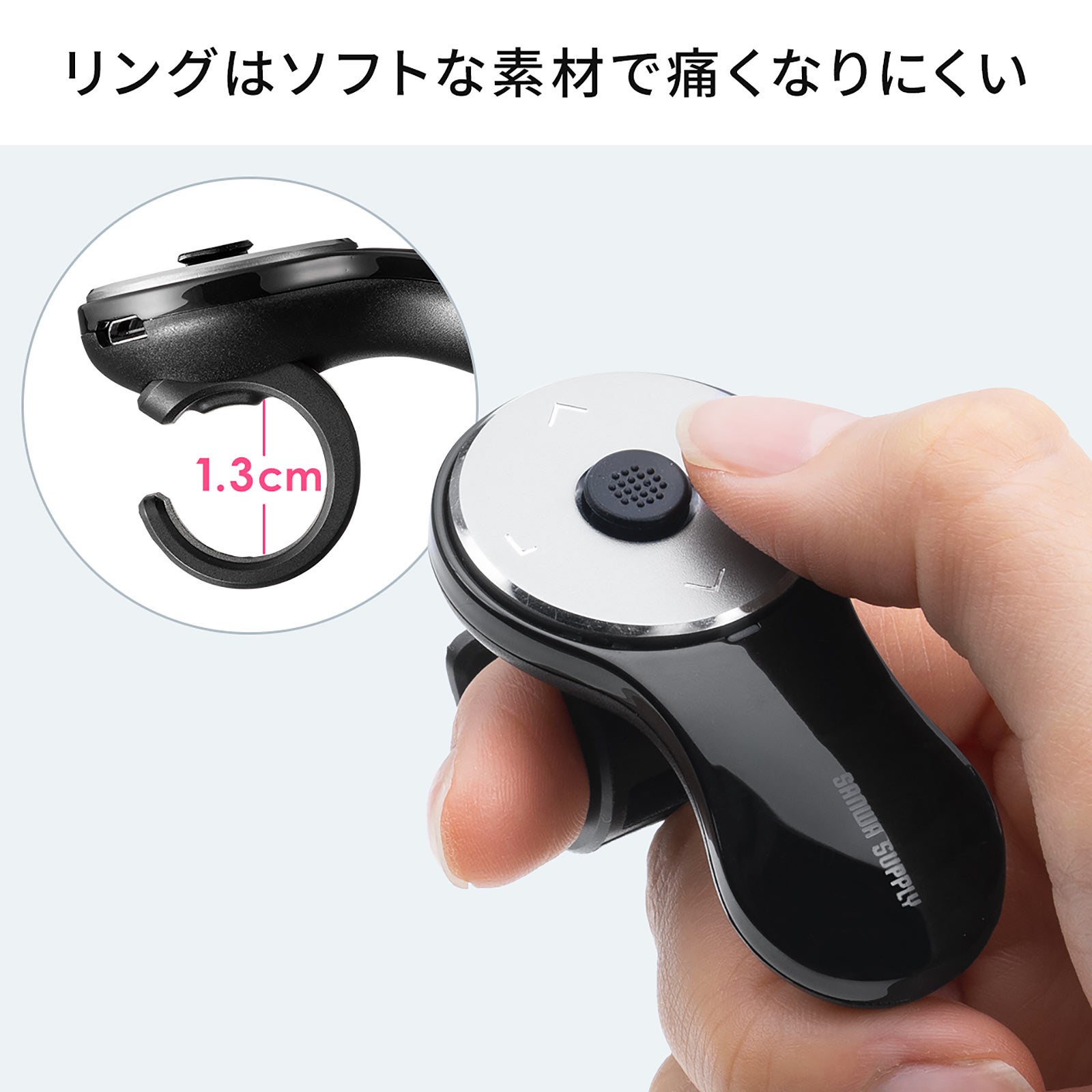 本製品は、指輪のように指に装着して使うリングマウスです。プレゼンソフトの操作やリラックスした姿勢でのパソコン操作に適しています。