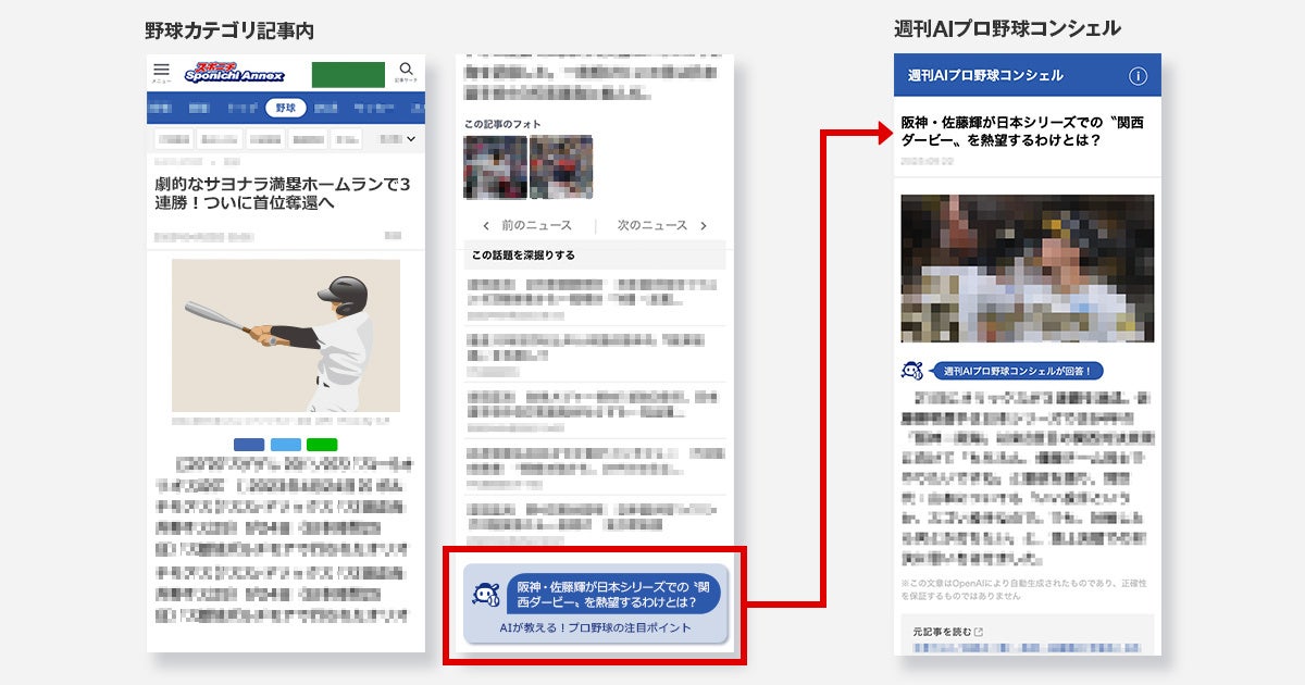 「週刊AIプロ野球コンシェル」は、「スポニチアネックス」上で前日以前に公開された野球カテゴリ記事をもとに編集者が質問を考案し、それに対してAIが回答文を自動生成してQ&A形式の記事にまとめるサービスです。ユーザーは通常記事内に表示される「週刊AIプロ野球コンシェル」の別の話題の見出し(質問)バナーをクリックすることで、興味のある情報をピンポイントかつより深く知ることができます。