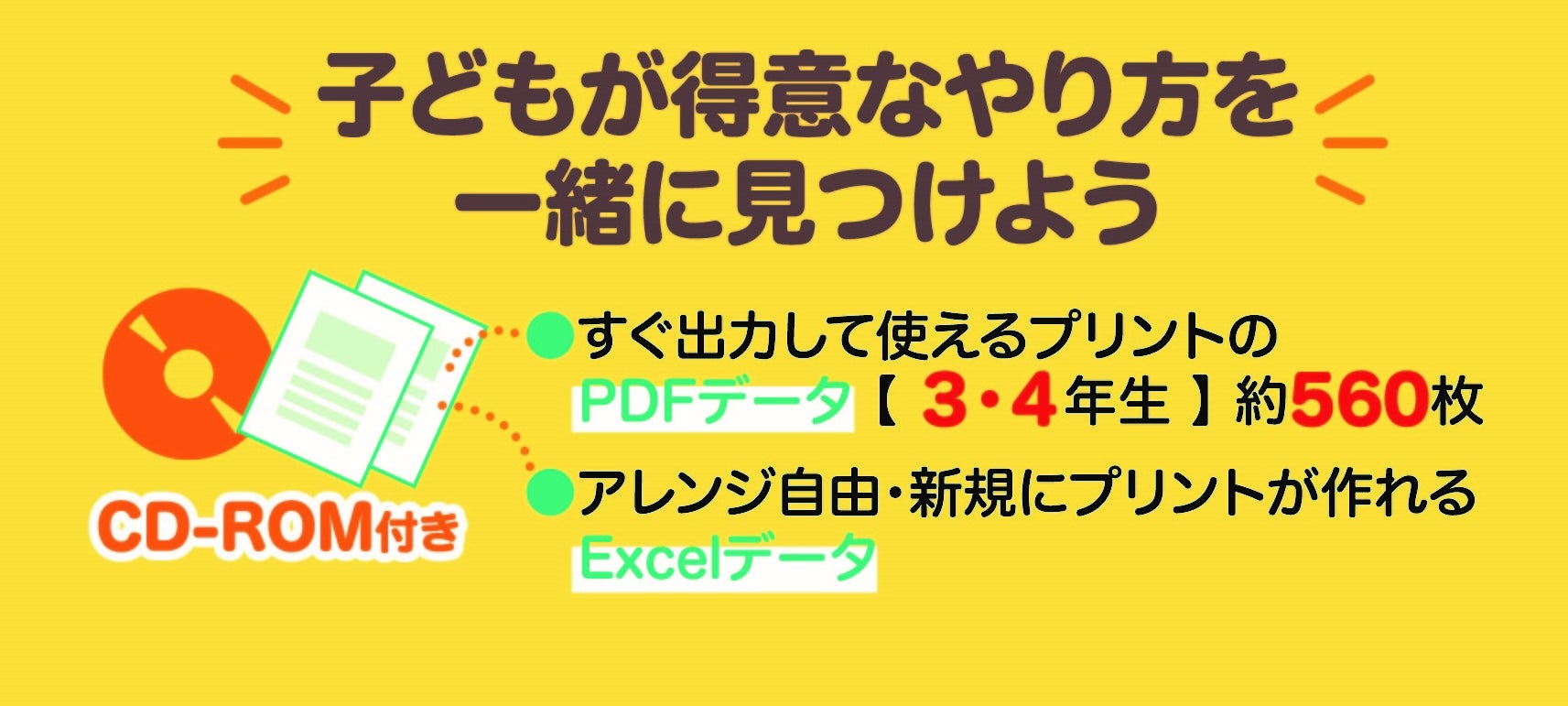 付属のCD-ROMには、そのまま出力して使えるプリント(PDF)を、3・4年生の漢字だけでなんと560枚以上も収録! さらに、お子さんに合わせて学習する漢字の学年や組み合わせを自由に変更したり、新規に作成したりできるエクセルデータもあります。