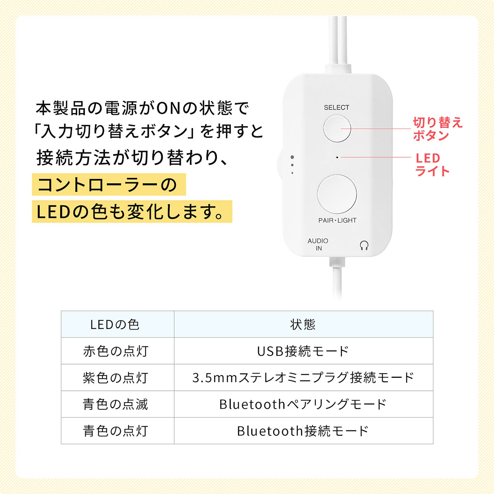 LEDの色や接続方法の切り替え、音量調整などを行えるリモコンが付いています。