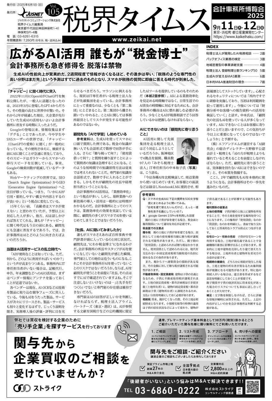 株式会社クリーク・アンド・リバー社の会計分野の子会社であるジャスネットコミュニケーションズ株式会社は、税理士業界の専門紙『税界タイムス105号』を発行しました。