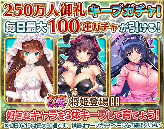合同会社EXNOA(本社:東京都港区、CEO:村中 悠介、URL: https://games.dmm.com/)は、戦国乱世で420名以上の可愛い将姫(しょうき)達と契りを繰り広げながら天下統一を目指している龍人様が全国で250万人を超えた全年齢向け萌える戦国ゲーム『戦乱プリンセス』(以下、"戦プリ"(せんぷり))のスマートフォンおよびPCゲームサービス(https://games.dmm.com/detail/senran/)にて、06/15(木)より『250万人御礼キャンペーン』を開催することをお知らせいたします。