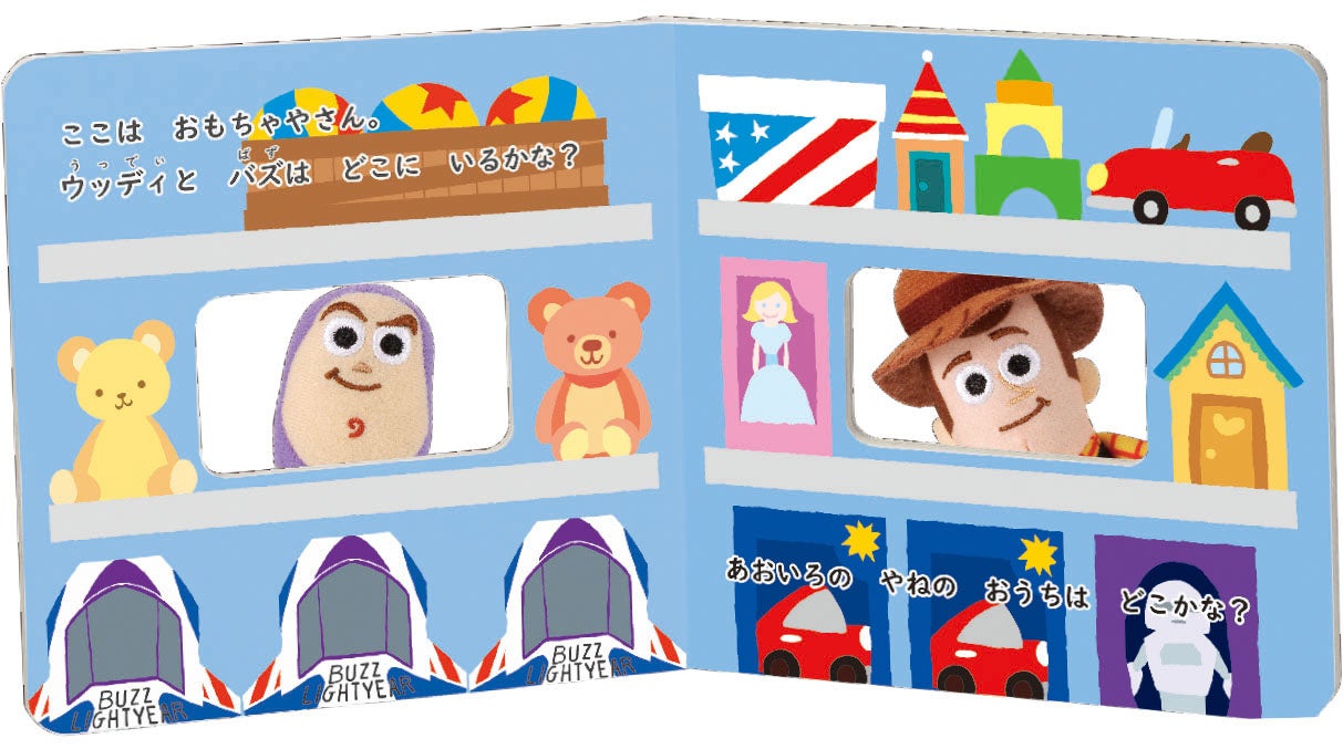絵本が四角く穴あきになっているので、ウッディとバズを穴から覗かせて絵本のシーンで遊べます。