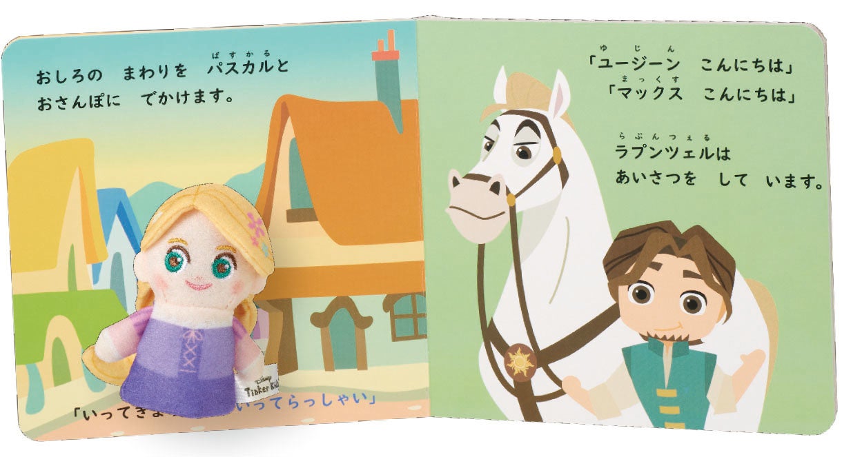 ラプンツェルとパスカルの指人形で「こんにちは。」とおじぎをしたり絵本のシーンで遊べます。