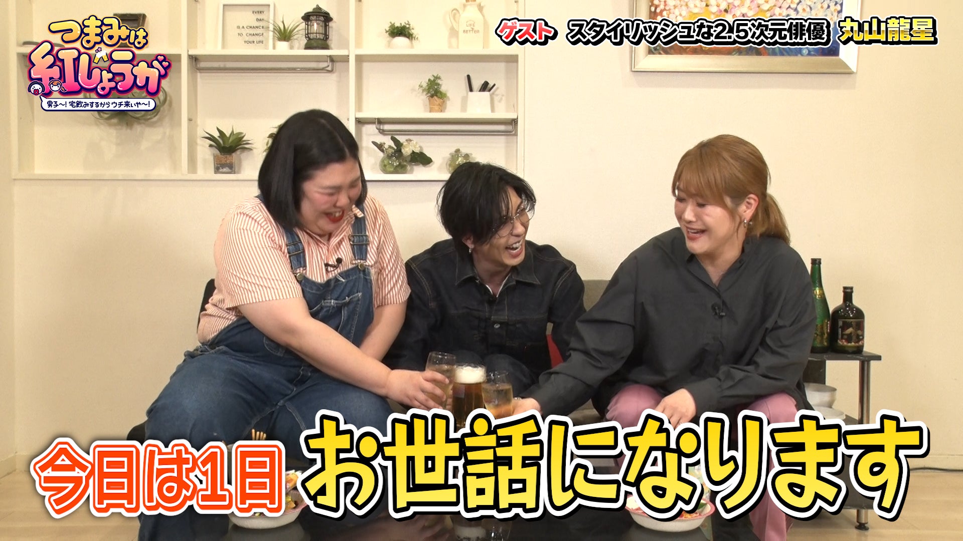 今回のゲストは、スタイリッシュな2.5次元俳優である丸山龍星。メガネをかけての登場に、稲田が「カッコいい!メガネ!」と開口一番に褒めると、「この収録のために今日買って来たんです!」と意気込みを明かします。丸山は「うれしいんです、2人とご一緒できて!」と、紅しょうがとの共演に喜んでいる様子で、その勢いのままに乾杯のビールもグイグイいきます。