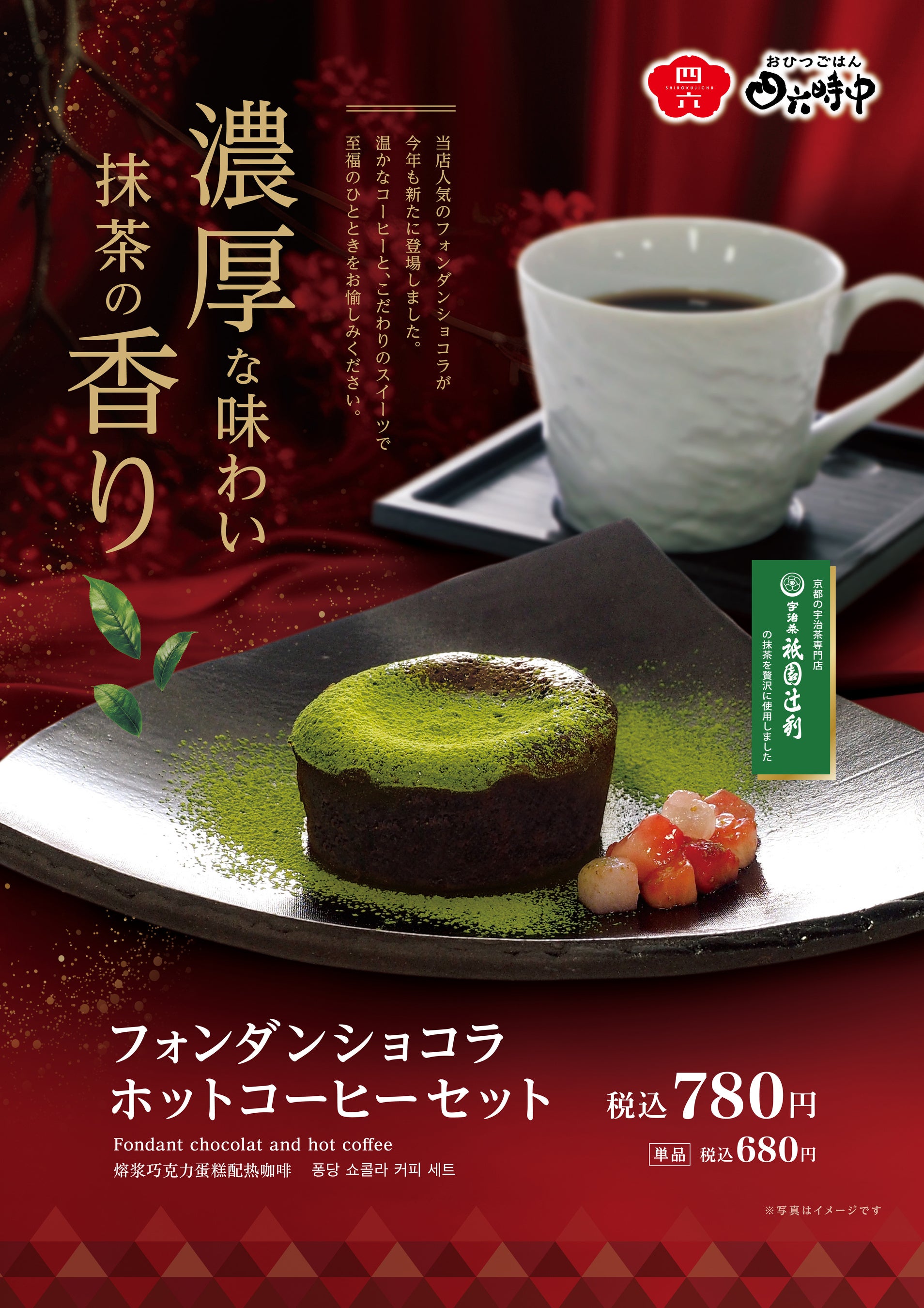 当社は、食を通じ歳時を感じていただけるよう、季節限定スイーツを展開しています。今回ご用意したのはこの時季に最適な「フォンダンショコラ」。旬のベリーと祇園辻利*の抹茶粉を添えた風雅な仕立てとなっており、中から溶け出したほんのり温かく濃厚なチョコレートと抹茶の香りが、甘さと苦みの絶妙なバランスを生み出します。さらに一杯ずつミル挽きした風味豊かなコーヒーをセットにしたお得な「フォンダンショコラホットコーヒーセット」もご用意しました。温かなコーヒーとともに、こだわりのスイーツで至福のひとときをお楽しみいただける期間限定の商品です。
