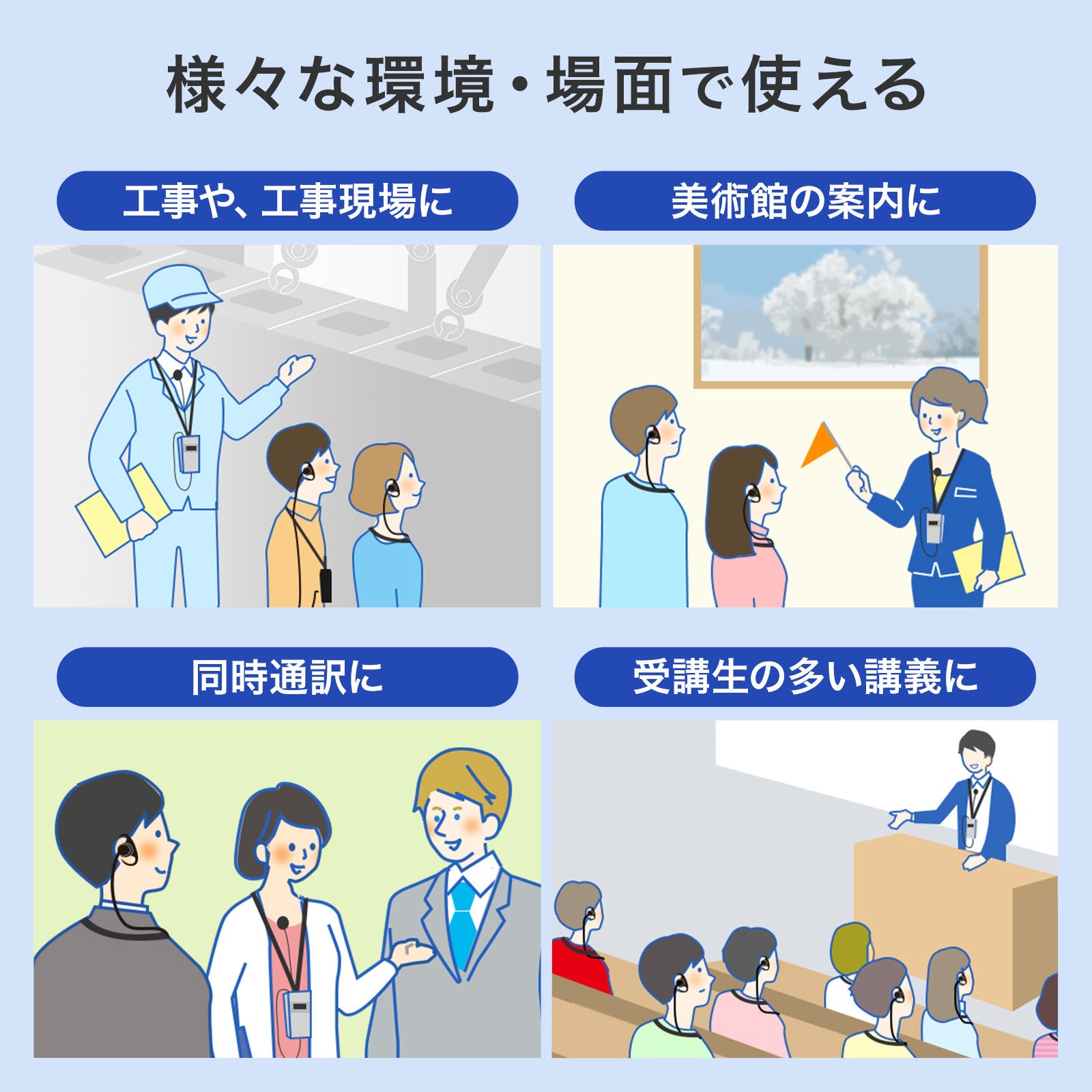 工場見学や美術館の案内、同時通訳や受講生の多い講義など、様々な環境・場面で使えます。密や飛散防止対策、ソーシャルディスタンス確保にも最適です。