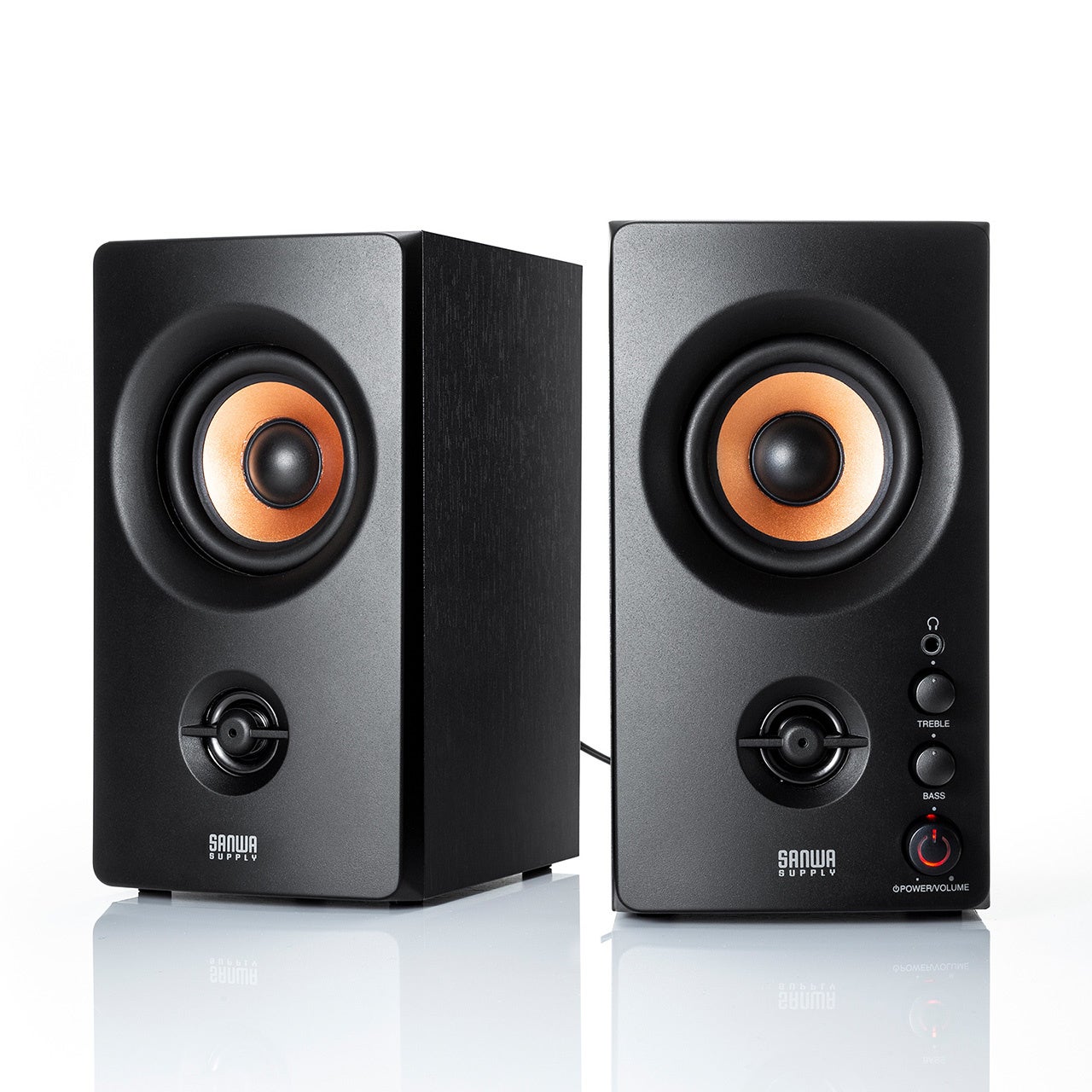 本製品は迫力のある重低音が再現可能な2chスピーカーです。大口径3インチのウーファーユニット搭載。剛性の高い木製キャビネットがウーファー性能を引き出し、豊かな響きと迫力のある重低音を再現します。また、1インチのツィーターユニットを搭載で高音がきれいに聞こえます。操作しやすい前面に、低音・高音コントロールダイヤル、ボリュームコントロールダイヤルを搭載。思いのまま音質をコントロールできます。