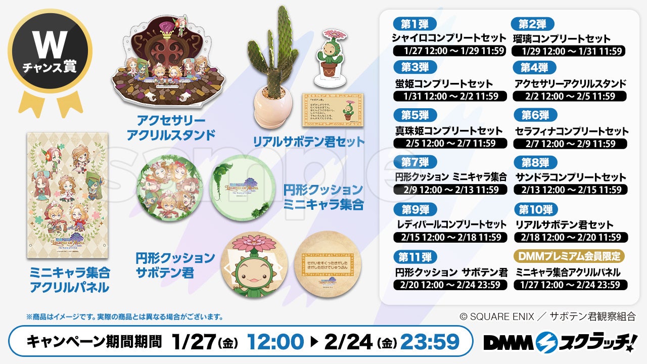 Wチャンス賞には各キャラクターのスペシャルなコンプリートセットの他、今作でのメインストーリーである珠魅たちの故郷をイメージした「アクセサリースタンド」、さらには本物のサボテンが当たるユニークな「リアルサボテン君セット」などここでしか手に入らないラインナップとなっております。