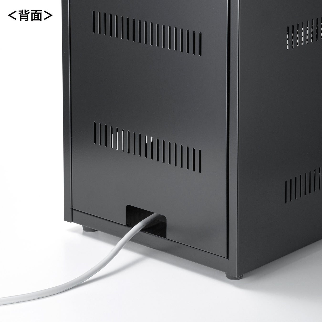 前扉、背面パネルには鍵が付いており、収納物を盗難やイタズラから守るため、安心して機器を収納できます。さらに側面にはセキュリティワイヤーに対応した穴もあり、セキュリティワイヤーを取り付けることで収納ボックス自体の盗難防止にもつながります。また、背面パネルは取り外し可能です。