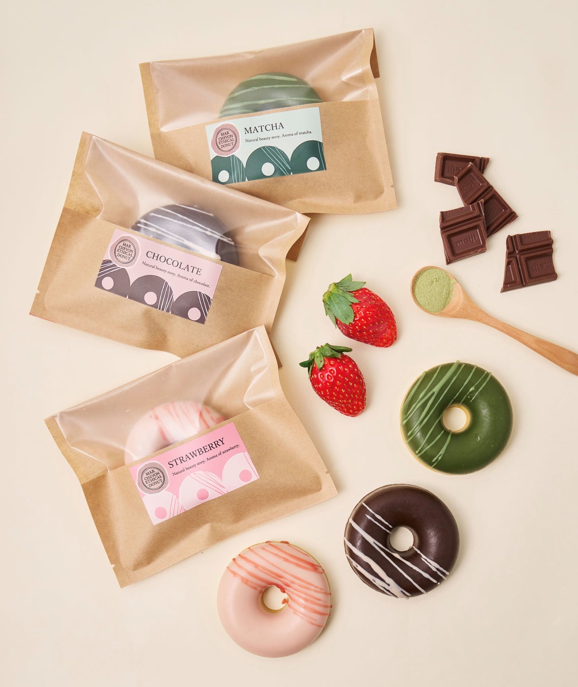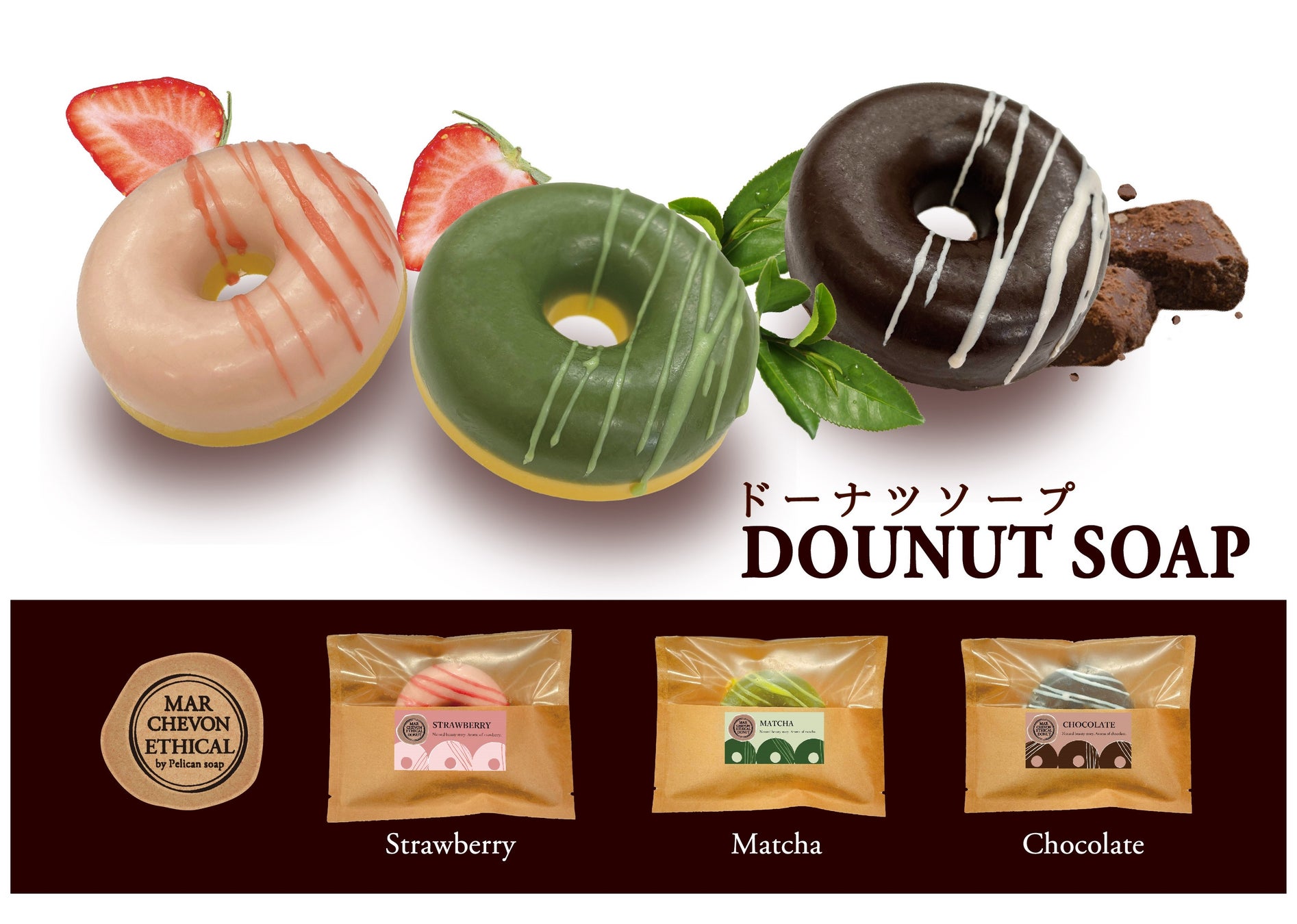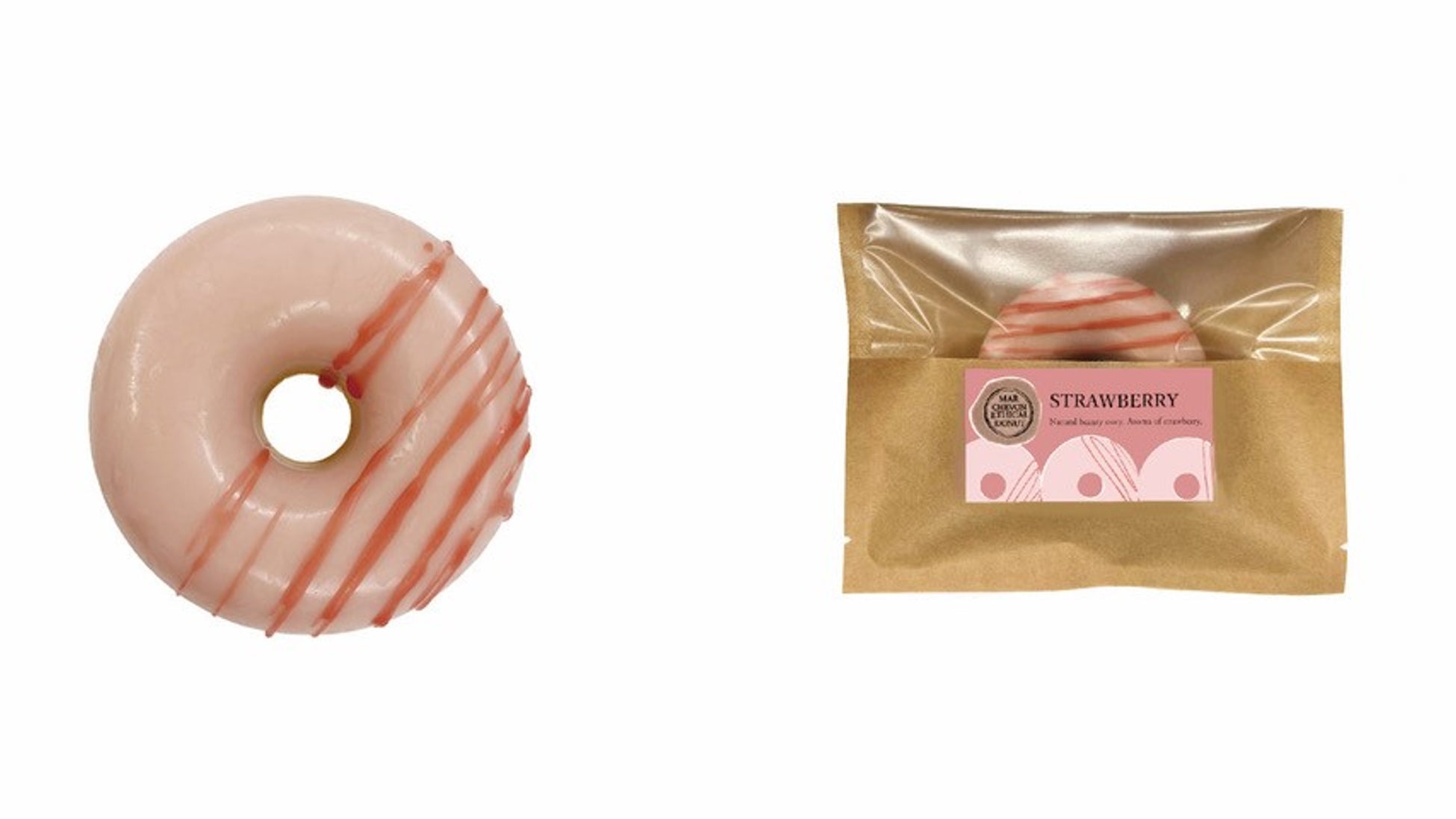新商品の「マルシェボン ドーナツソープ」はソースをかけたドーナツをデザインし、どれも本物のような甘い香りがします。ストロベリー・抹茶・チョコレートそれぞれには、環境に優しい取り組みによってつくられた保湿成分を配合しています。紙袋に1つずつ個包装されているため、自分へのご褒美や、バレンタインやホワイトデーなどのプレゼントにぴったりです。